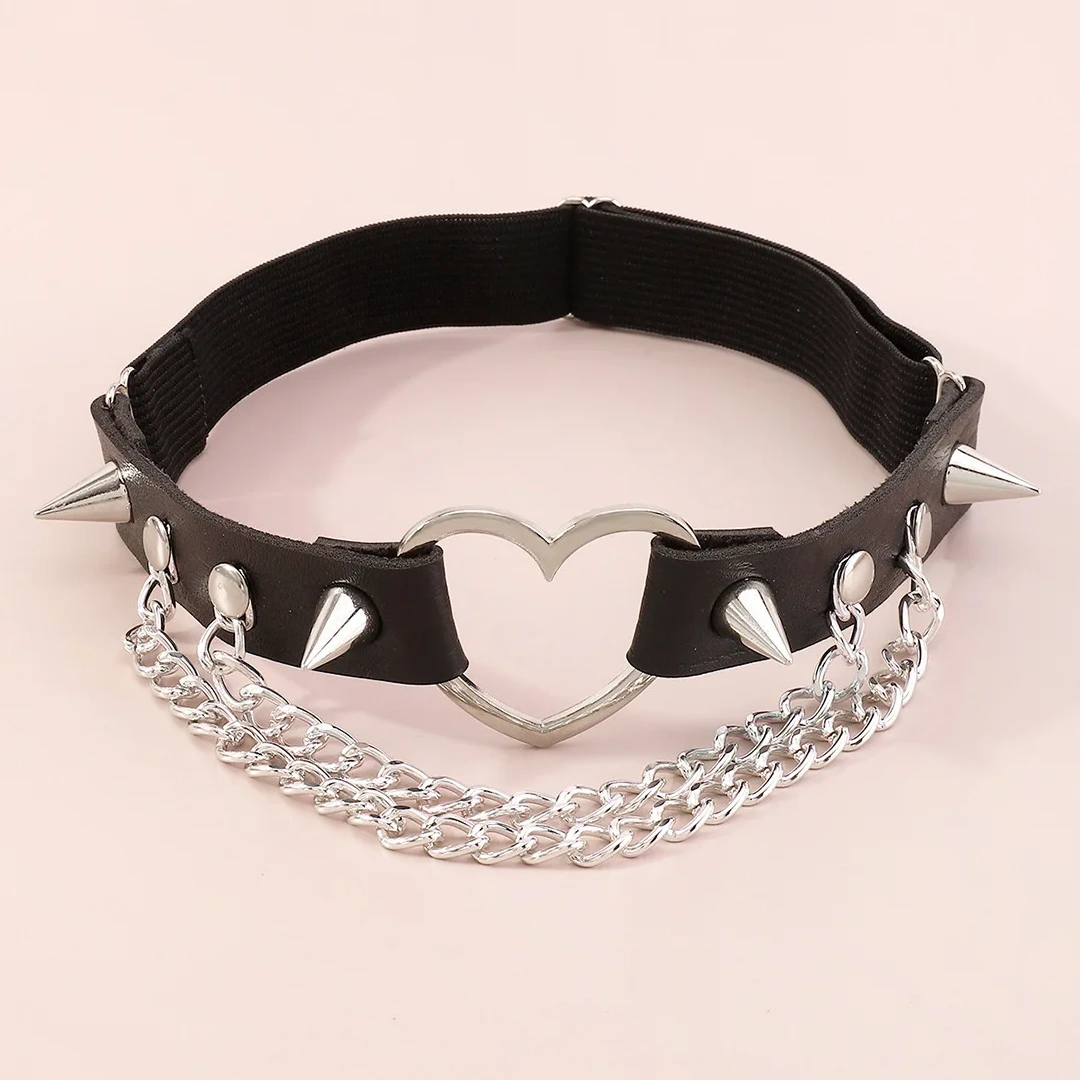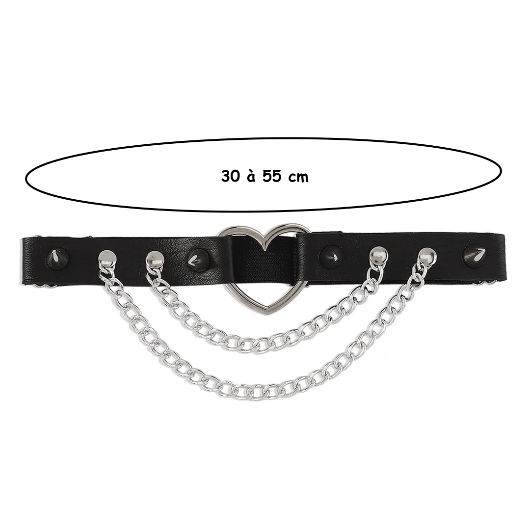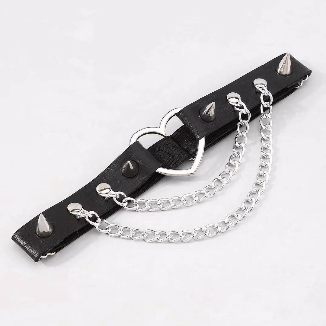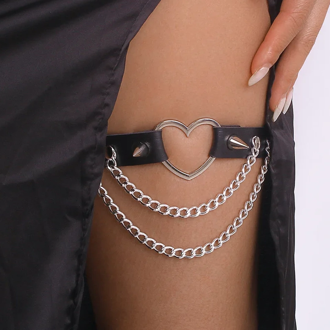 Sublimez votre allure avec cette jarretière gothique punk en cuir clouté, ornée d’un cœur en métal et de chaînes pendantes. Un accessoire de jambe qui oscille entre passion et rébellion.
