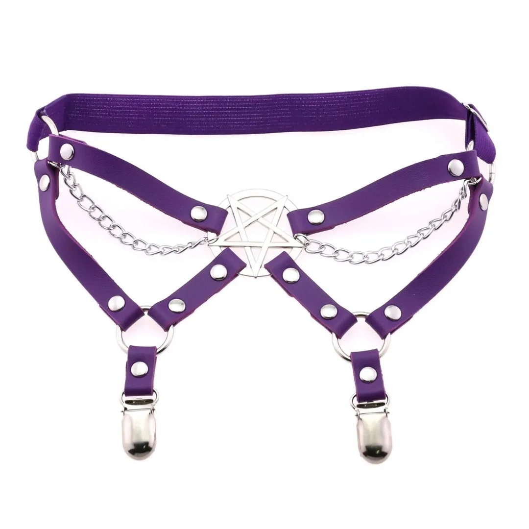 Révélez votre sensualité avec cette jarretière à pentagramme inversé & chaînes métalliques. Cuir noir/violet, clips pour maintenir vos bas, ajustable 30–55cm. Vendue à l’unité.