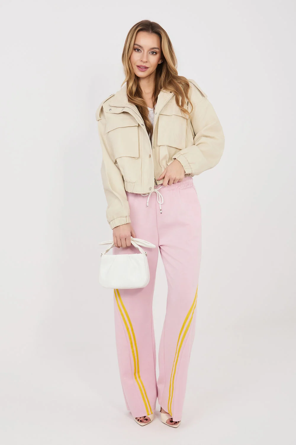 Les pantalons de survêtement pour femmes sont une proposition confortable et stylée pour tous les jours, idéale pour les femmes qui apprécient le confort et un look décontracté à la mode. Ils conviendront parfaitement pour les activités quotidiennes, les promenades, les courses ou la détente à la maison. Le modèle est fabriqué dans un mélange agréable au toucher de polyester, viscose et élasthanne. Grâce à cela, les pantalons sont doux, élastiques et s’adaptent bien à la silhouette, offrant une liberté de mouvement totale. Les pantalons ont une taille haute qui assure un confort de port et souligne joliment la taille. À la taille, il y a un cordon pratique qui permet un ajustement individuel à la silhouette. Des poches pratiques sont placées sur les côtés, idéales pour les petits objets. Le tissu lisse confère aux pantalons un caractère polyvalent, tandis que les bandes latérales en diagonale placées sur le devant des jambes ajoutent une touche moderne et sportivement élégante à l’ensemble. C’est un excellent choix pour les femmes qui veulent combiner le confort des survêtements avec un look quotidien à la mode.