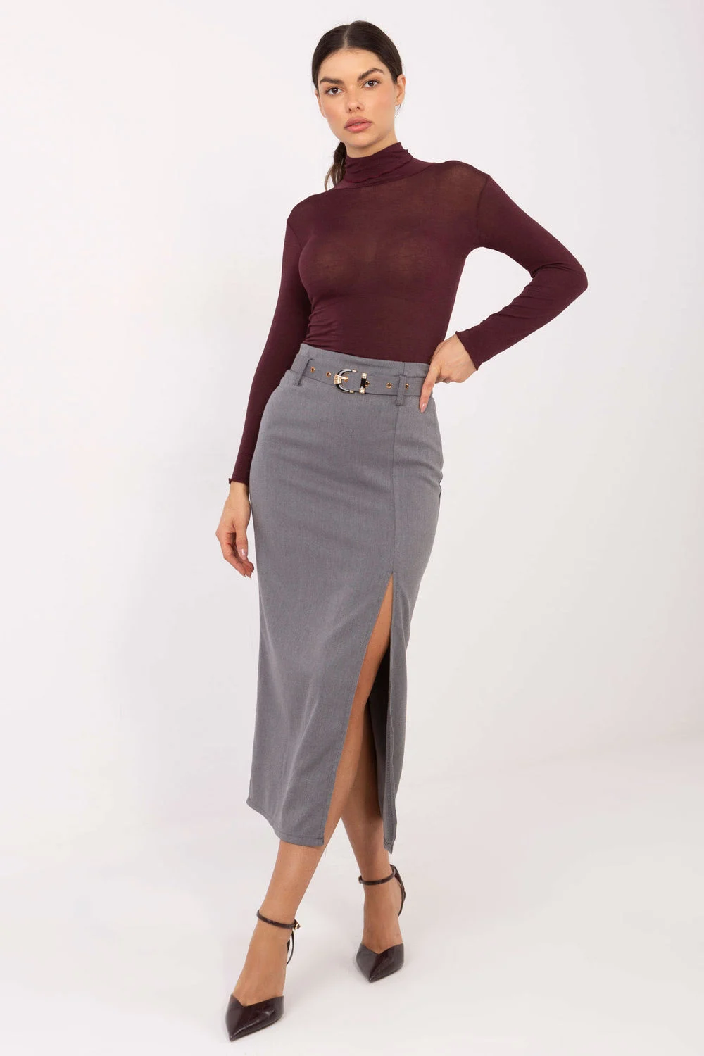 Jupe élégante et stylée de longueur midi, parfaite pour des occasions spéciales, des réceptions et des sorties en soirée. Fabriquée à partir d’un mélange de polyester, d’élasthanne et de viscose, ce qui rend le tissu agréable au toucher, légèrement élastique et qui s’ajuste joliment à la silhouette. Le motif lisse dominant souligne le caractère classique et intemporel du modèle. La jupe a une fente à l’avant qui lui donne un accent moderne et féminin, tout en offrant une liberté de mouvement. À la taille, il y a une ceinture à boutons qui permet un ajustement parfait et met en valeur la silhouette féminine. Le tout est fermé par une fermeture éclair dissimulée, conservant un look élégant et minimaliste.