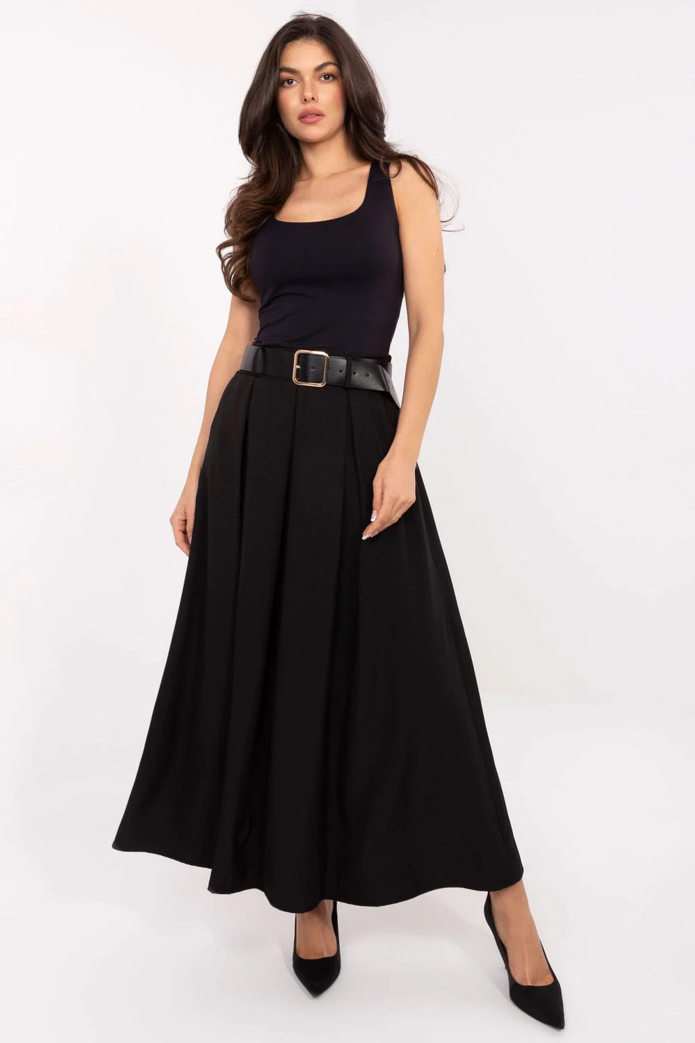 Jupe longue évasée maxi élégante et féminine avec des contre-plis sur le devant, alliant confort et style classique adapté aussi bien au travail qu’aux sorties quotidiennes. Fabriquée à partir d’un mélange de viscose et de polyester de haute qualité, elle est légère, aérée et épouse parfaitement la silhouette. Le modèle a une bande élastique à l’arrière pour un ajustement parfait à la taille, ainsi qu’une ceinture fermée permettant de subtilement souligner la silhouette. Les poches latérales insérées ajoutent de la fonctionnalité, tandis que les contre-plis à l’avant donnent à la jupe une forme élégante et évasée. La jupe a un motif lisse, pas de fermeture classique et une longueur maxi, ce qui la rend polyvalente et facile à styliser. C’est une proposition idéale pour les occasions quotidiennes, les sorties et les événements élégants, alliant confort et coupe intemporelle.