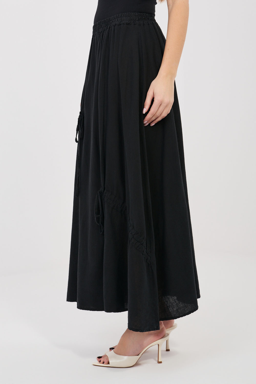 Jupe longue pour femme dans un style décontracté, idéale pour les tenues quotidiennes. Son motif lisse la rend polyvalente et facile à assortir avec différents éléments de garde-robe, des blouses légères aux chemises classiques ou aux hauts. Le modèle est fabriqué à partir d’un mélange de lyocell, de coton et de lin de haute qualité, ce qui rend le tissu léger, respirant et agréable à porter. Les fibres naturelles font que la jupe est particulièrement adaptée aux journées plus chaudes, offrant un confort toute la journée. La jupe a une ceinture élastique cousue à la taille, garantissant un ajustement confortable à la silhouette et une liberté de mouvement. L’absence de fermeture classique rend le modèle facile et rapide à enfiler. Les liens décoratifs à l’avant ajoutent un caractère féminin subtil à l’ensemble et constituent un accent stylé pour la finition.