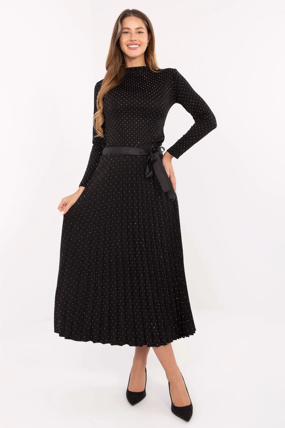 Jupe plissée élégante et féminine de longueur midi, fabriquée en viscose de haute qualité avec une touche d’élasthanne, offrant légèreté, respirabilité et confort. Le modèle est doté d’une taille élastique, ce qui le rend parfaitement ajusté à la silhouette et ne nécessite pas de fermeture. Un autre avantage est la ceinture en forme d’écharpe à nouer, permettant de souligner la taille et donnant à la tenue un caractère élégant. Toute la surface du tissu est ornée de strass brillants, qui reflètent subtilement la lumière, ajoutant à la jupe un charme et une élégance exceptionnels. C’est une excellente proposition pour les occasions spéciales, les rencontres familiales ou les sorties élégantes chaque fois que vous voulez avoir l’air stylé et classe.