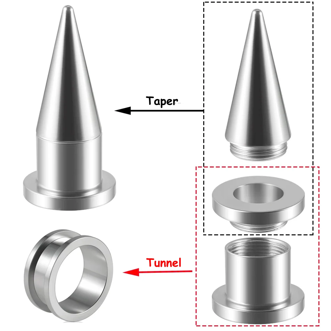 Kit taper & tunnel en acier chirurgical 316L pour écarteur d’oreille. Filetage interne, 3 couleurs, jusqu’à 10 mm. Pratique, progressif, élégant. Vente à l’unité ou en kit complet.
