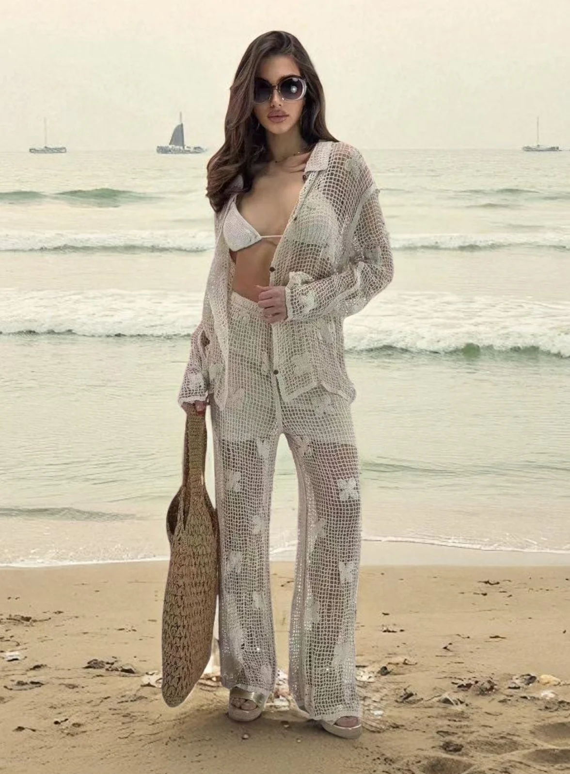 L’ensemble pantalon en crochet couleur sable est ultra tendance! Son rendu est fluide et évasé sur le bas. Portez le en ensemble avec sa jolie veste à boutons, façon chemise, ou dépareillé avec votre top fétiche! Crochet ajouré, au motif floral pour une transparence sur votre maillot de bain éventuellement. La partie taille et fesse est doublée d’une matière souple coton. Mais des dessous chair ou un débardeur fait totalement l’affaire. Tout est possible: à la plage comme à la ville! On craque sur son style et ses jolies finitions. Se ferme par boutons et offre un joli décolleté au choix!