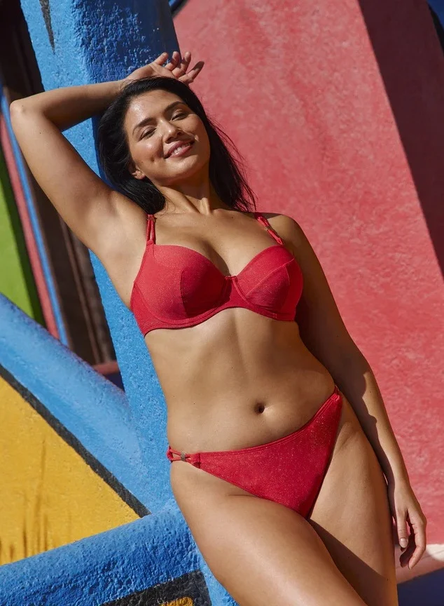 Laissez-vous éblouir par ce maillot de bain classique à armatures et son look ultra moderne! Lycra brillant doté d’un doux lurex, d’un joli rouge coquelicot. Ce maillot de bain à la forme de votre soutien-gorge vous donera un maintien parfait! Notez que les bretelles sont réglables dans le dos. Vous aimerez sa profondeur de bonnet adaptée à vos formes. Le slip taille haute offre une couvrance élevée, du fait de son jeu de liens réglables sur les côtés, il ajustera sa tenue comme il vous plaira!