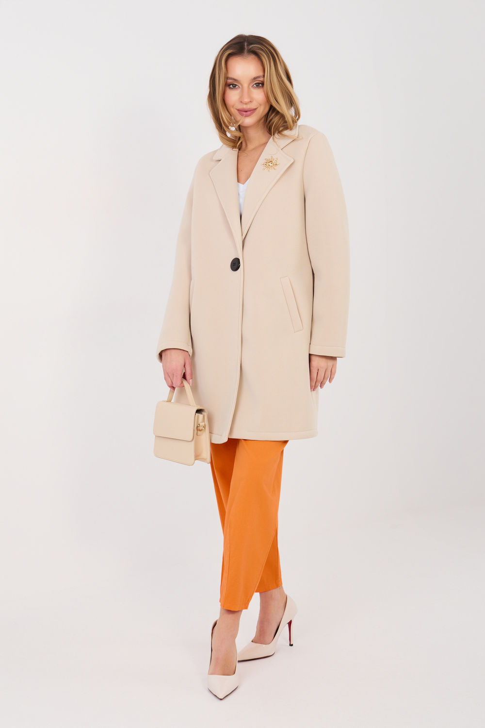 Un manteau pour femme élégant de coupe classique est une proposition idéale pour la saison de transition, l’automne, l’hiver et le printemps. Ce modèle conviendra parfaitement aussi bien pour les tenues du quotidien que comme couche extérieure pour le travail, mettant en valeur un look professionnel et stylé. Fabriqué en matériau de haute qualité à base de polyester avec une touche d’élasthanne, le manteau est léger, extensible et agréable à porter. Le tissu garde bien sa forme tout en assurant confort et liberté de mouvement. Sans doublure, ce modèle conviendra comme couche polyvalente pour les journées plus chaudes et de transition. Le manteau a une longueur standard et des manches longues. Le col classique et les revers lui confèrent une élégance intemporelle. La fermeture simple par bouton souligne le caractère minimaliste de la coupe, et les poches pratiques augmentent la fonctionnalité. Le tout est complété par une broche décorative placée sur le revers, ajoutant une touche stylée et féminine.