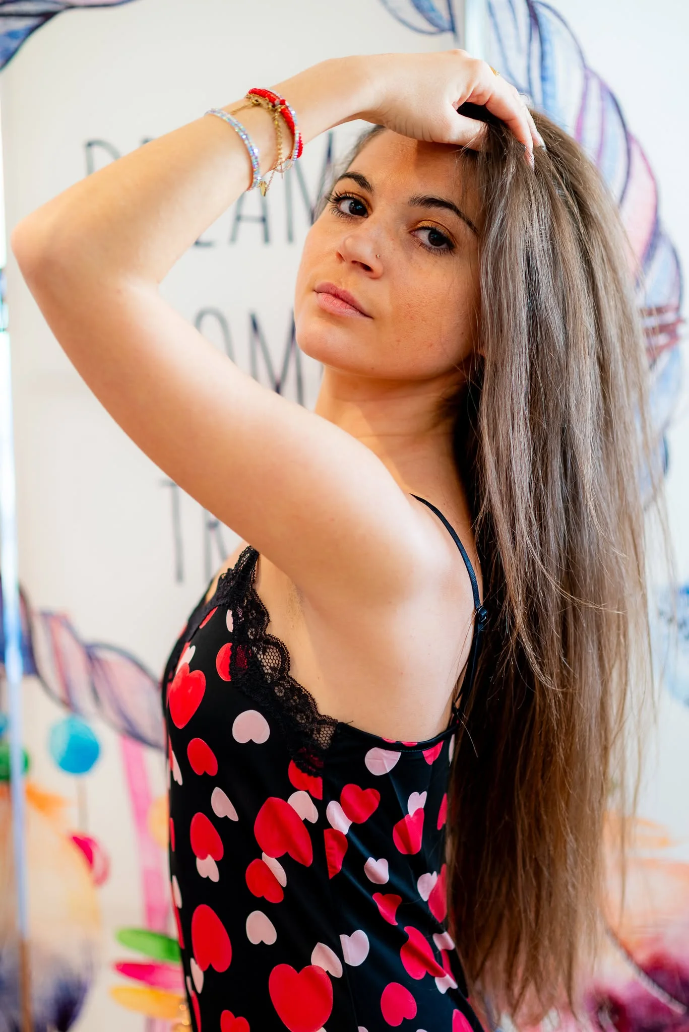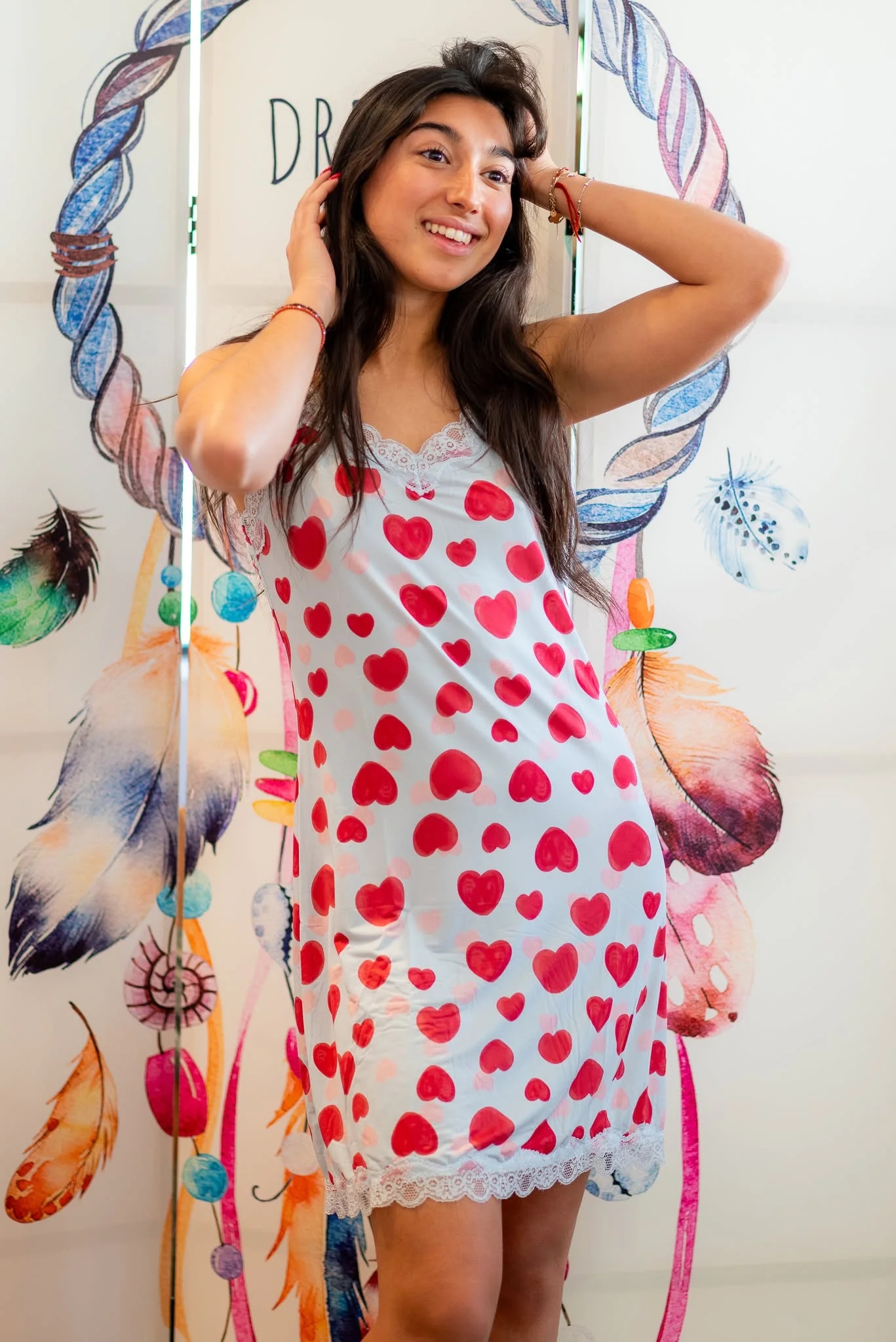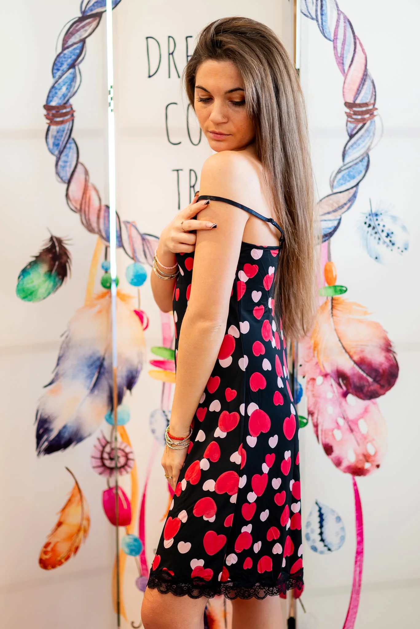 Sublime alliance de lycra et dentelle. La nuisette coeur au doux lycra et son motif coeurs de couleurs mélangées est pleine de douceur. Matière douce et soyeuse…ultra extensible pour un doux confort. Du S au XL