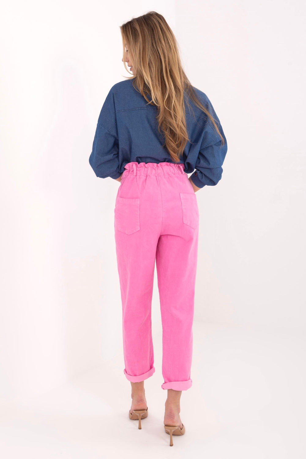 Les pantalons en velours côtelé décontractés de type paperbag sont une proposition confortable et élégante pour tous les jours. Le modèle à taille haute met joliment en valeur la taille, tandis que l’élastique cousu à la taille assure un confort de port et un ajustement parfait à la silhouette. L’absence de fermeture éclair augmente également le confort et donne à l’ensemble un caractère décontracté. Les jambes fuselées affinent subtilement les jambes, tandis que les poches latérales insérées ajoutent de la praticité. Les pantalons sont fabriqués à partir d’un mélange de coton et d’élasthanne, ce qui les rend doux, agréables au toucher et élastiques. C’est un choix parfait pour les tenues quotidiennes, se marient parfaitement aussi bien avec un simple t-shirt qu’avec un pull ample ou un pull ajusté.