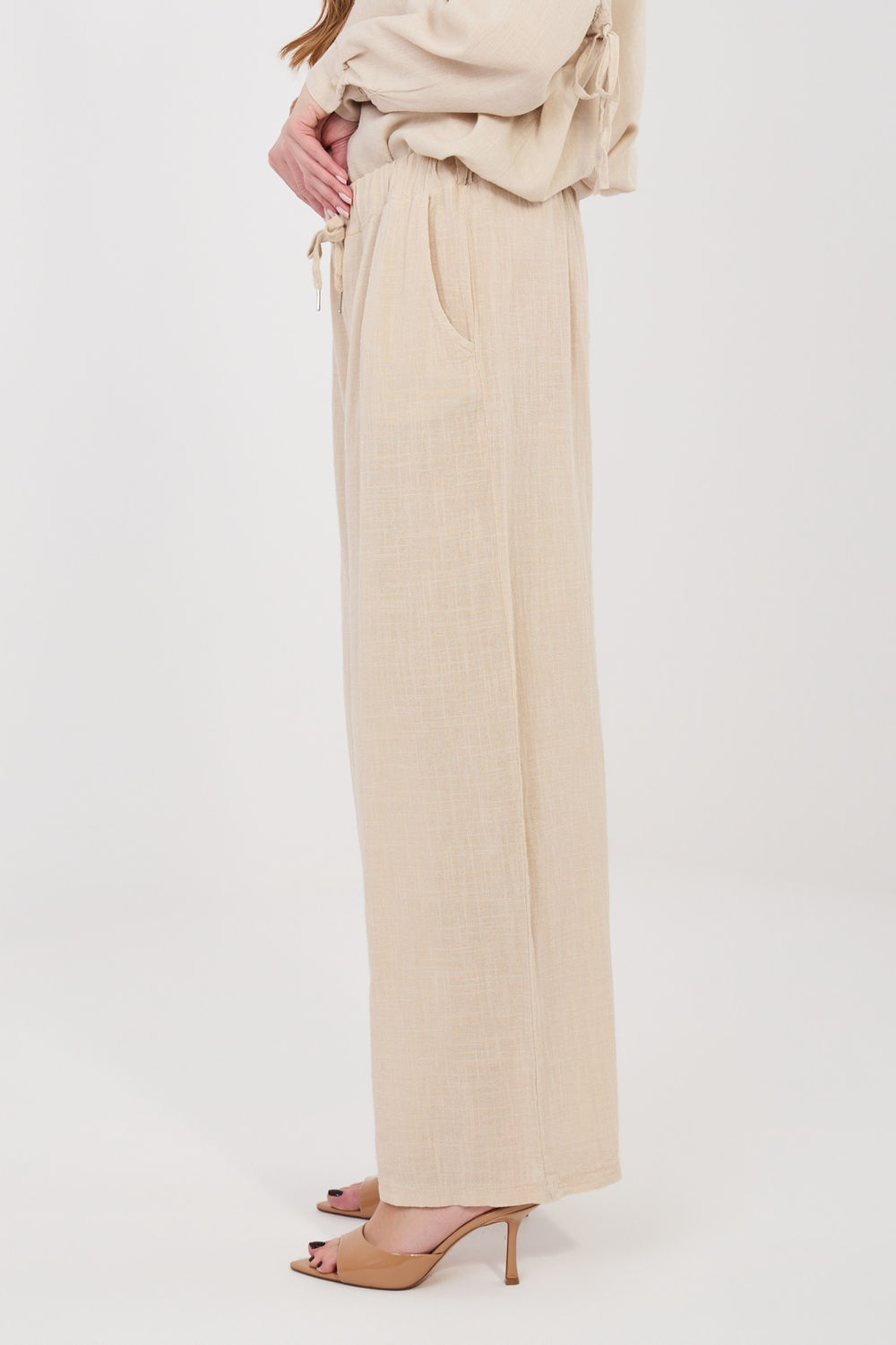 Pantalons élégants pour femmes à coupe large, alliant confort et style décontracté à la mode. Le modèle a des jambes larges, offrant une grande liberté de mouvement et s’inscrivant parfaitement dans les tendances actuelles. Les pantalons sont fabriqués en coton de haute qualité, doux, respirant et agréable pour la peau, ce qui les rend parfaits pour un usage quotidien. Le motif lisse souligne leur caractère universel et facilite leur adaptation à de nombreuses tenues. Le modèle à taille haute met joliment en valeur la taille, et la ceinture permet un ajustement confortable à la silhouette. Un autre atout sont les poches latérales pratiques, qui augmentent la fonctionnalité des pantalons. C’est une proposition parfaite pour des tenues décontractées ou plus élégantes.