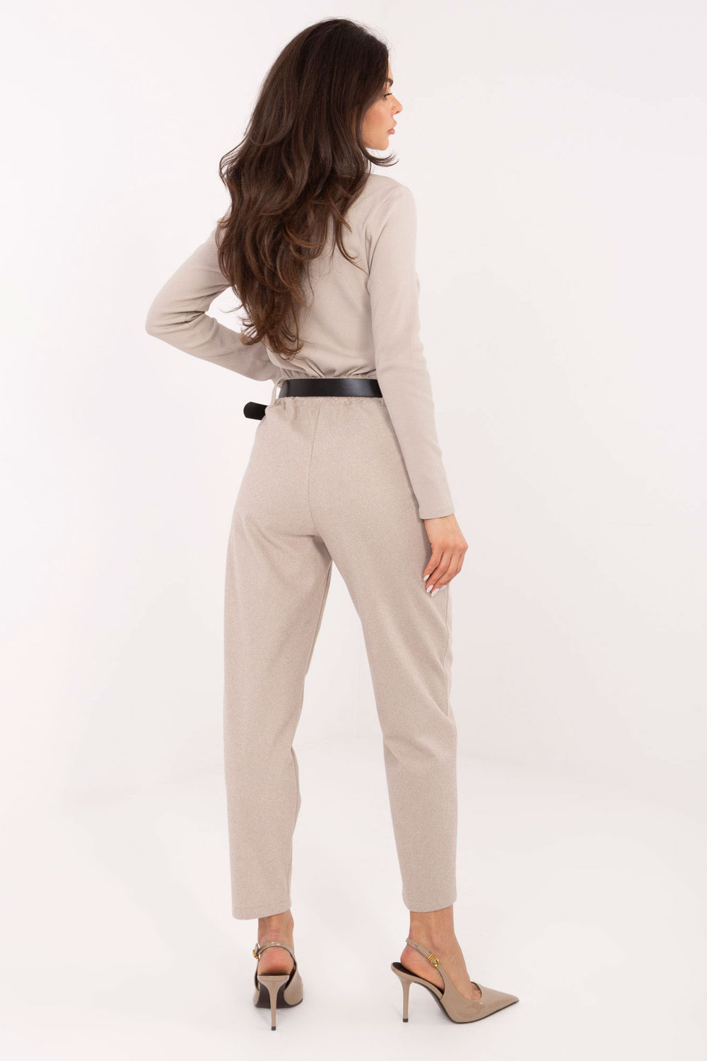 Les pantalons élégants pour femmes de type cigarettiers sont un excellent choix pour tous les jours et pour le travail. Fabriqués en polyester de haute qualité, ils allient durabilité, esthétique et confort. Le motif classique à chevrons leur confère un caractère élégant intemporel, parfait pour les tenues de bureau et décontractées. Le modèle taille haute met joliment en valeur la taille et assure un confort toute la journée. Les jambes fuselées affinent la silhouette de manière optique, lui donnant légèreté et des proportions harmonieuses. Les pantalons n’ont pas de fermeture traditionnelle, mais une bande élastique cousue à la taille assure un ajustement parfait. Les poches latérales augmentent la fonctionnalité, tandis que la ceinture à boucle est un accessoire pratique et élégant qui complète l’ensemble du look élégant.