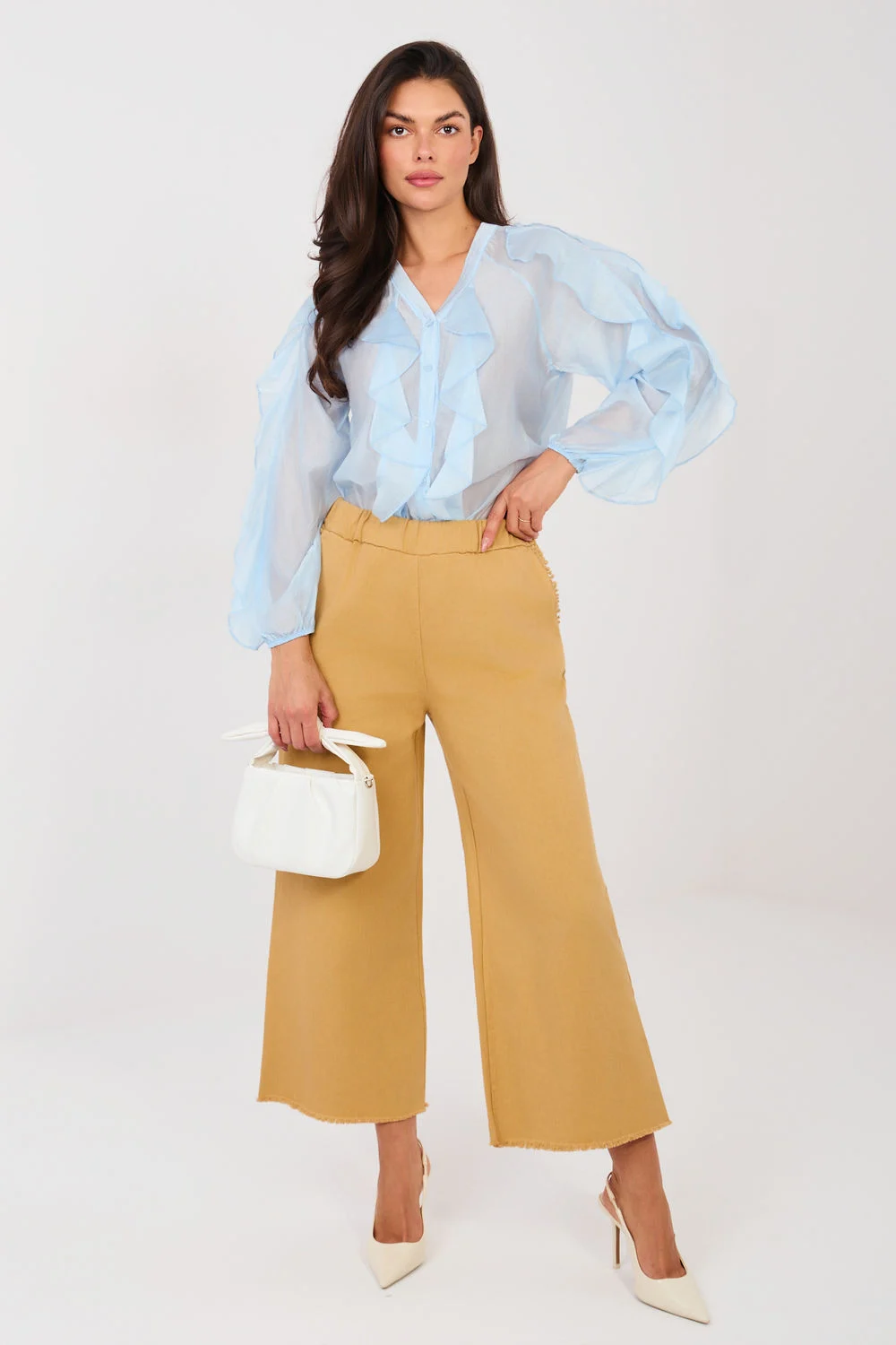 Pantalon large pour femme de style décontracté est une proposition confortable et élégante pour tous les jours et pour le travail. Fabriqué en coton de haute qualité avec une touche d’élasthanne, il assure un confort de port, une élasticité et un bon ajustement à la silhouette. Le modèle lisse avec une taille haute met joliment en valeur la taille, tandis que la ceinture élastique cousue dans la taille garantit confort et liberté de mouvement. Les larges jambes ornées d’une finition élégante confèrent aux pantalons un caractère moderne et tendance. Les pantalons n’ont pas de fermeture éclair, ce qui augmente encore le confort d’utilisation. Les poches latérales pratiques ajoutent de la fonctionnalité au modèle. Parfait pour les tenues de tous les jours avec une chemise, un chemisier ou un pull.