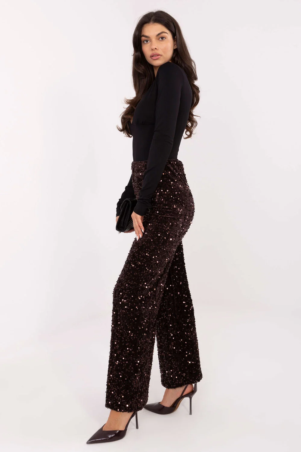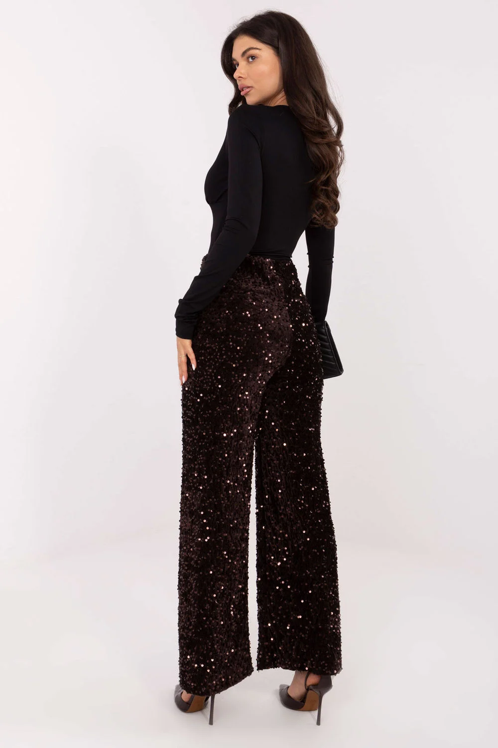 Pantalons élégants en tissu à sequins, conçus pour des occasions spéciales telles que des sorties habillées et des fêtes. Fabriqués à partir d’un mélange de polyester et d’élasthanne, les pantalons offrent un ajustement confortable et un léger éclat grâce à l’application de sequins qui leur donne de la profondeur. Le modèle avec des jambes droites et une taille haute allonge subtilement la silhouette. L’absence de fermeture éclair et de poches donne à l’ensemble un aspect lisse et minimaliste, tandis que la doublure délicate assure un confort de port. Ces pantalons constituent le choix idéal lorsque vous souhaitez ajouter une touche élégante et spectaculaire à votre tenue.