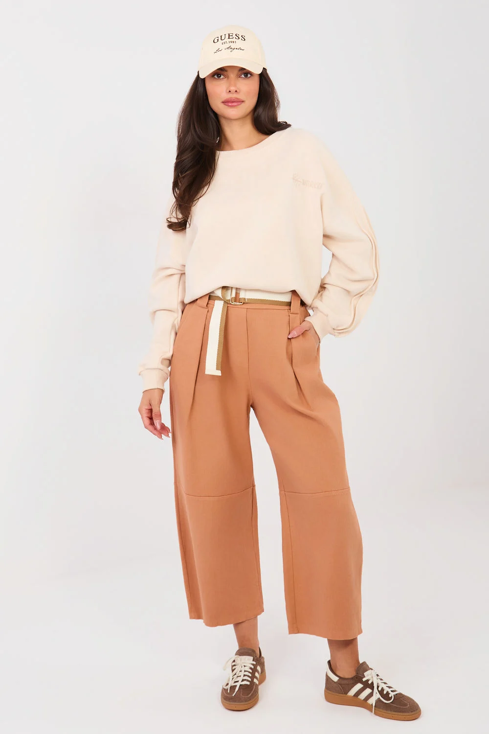 Pantalons en jean pour femmes de style large, alliant confort et style moderne. Fabriqués en coton de haute qualité avec ajout d’élasthanne, ils garantissent un confort et une liberté de mouvement tout au long de la journée. Le modèle a une taille haute et une ceinture élastique cousue, s’adaptant parfaitement à la silhouette sans nécessiter de fermeture. Les plis à l’avant ajoutent de l’élégance et affinent visuellement les jambes. Les larges jambes soulignent le caractère à la mode des pantalons et assurent une fluidité dans la tenue. Les pantalons sont équipés de poches latérales discrètes et d’une ceinture à boucle, qui est à la fois pratique et stylée. Le motif lisse fait que le modèle convient parfaitement aussi bien aux tenues de tous les jours qu’au travail dans un style décontracté. Polyvalents, confortables et élégants, une base idéale pour de nombreux ensembles.