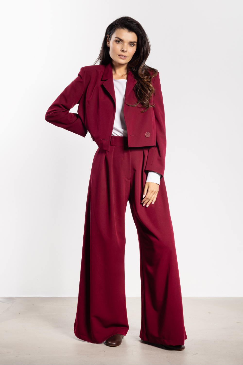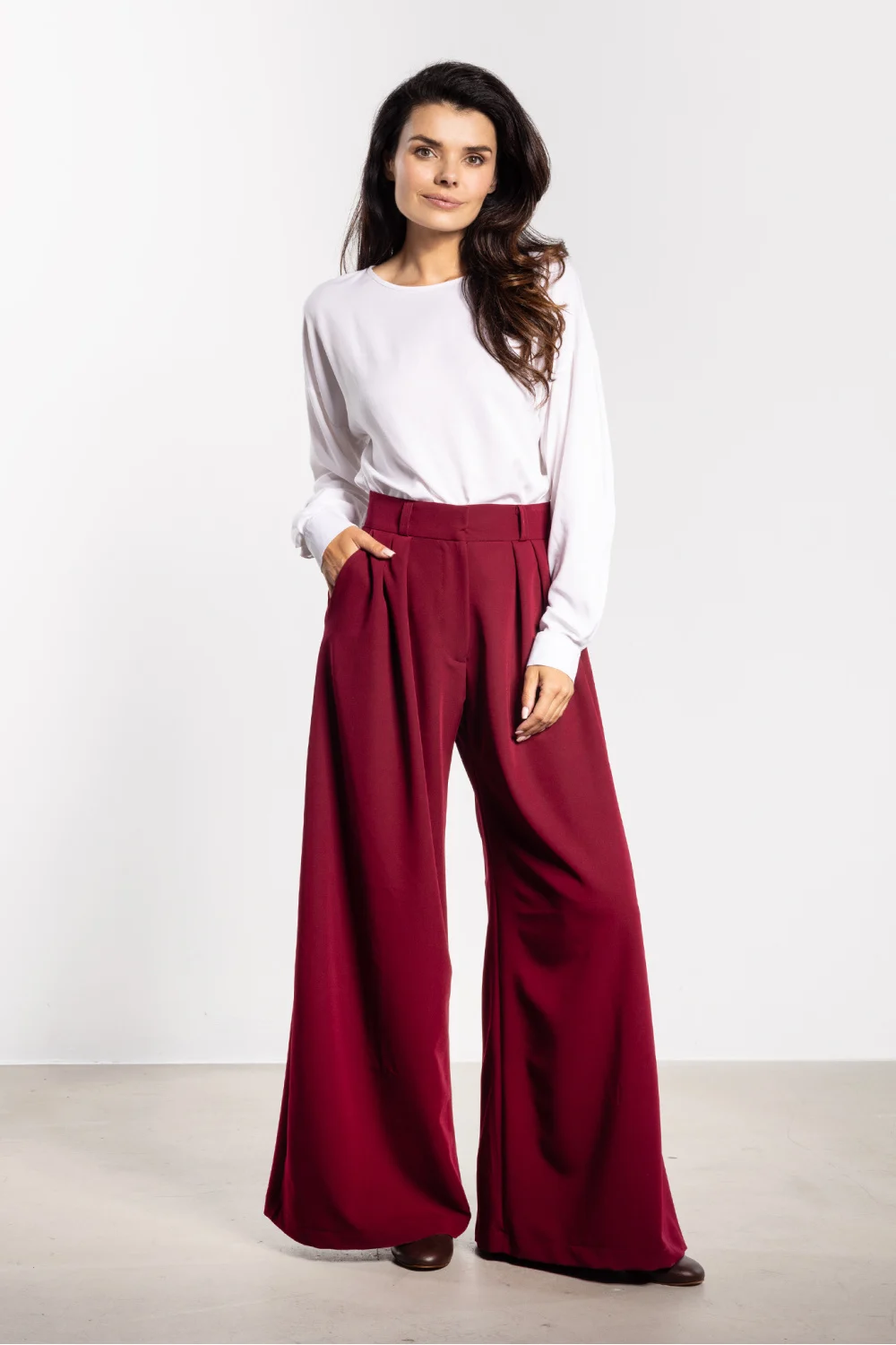 Pantalons élégants à jambes larges alliant confort et élégance. La taille haute souligne la taille et allonge la silhouette de manière optique, tandis que les jambes évasées apportent légèreté et caractère moderne. Ce modèle conviendra aussi bien aux tenues de tous les jours qu’aux tenues de bureau ou plus formelles. Il se marie parfaitement avec une veste, une chemise ou un pull, et les poches latérales pratiques augmentent sa fonctionnalité.