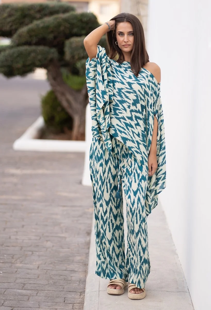 Ultra féminin ce pantalon fluide de la collection Isla Bonita! Se porte en ensemble avec son sublime kaftan pour un total look. Taille élastique et fluidité totale sur la jambe. Ce superbe pantalon aux couleurs de l’été, est fluide et évasé sur la jambe. Sa taille est joliment marquée par un élastique pour un confort ultime. (lien d’attache à nouer)