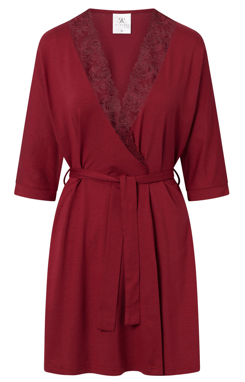 Robe de chambre en tissu lisse avec manches 3/4 et lien à la taille. Robe de chambre avec embellissements en dentelle.