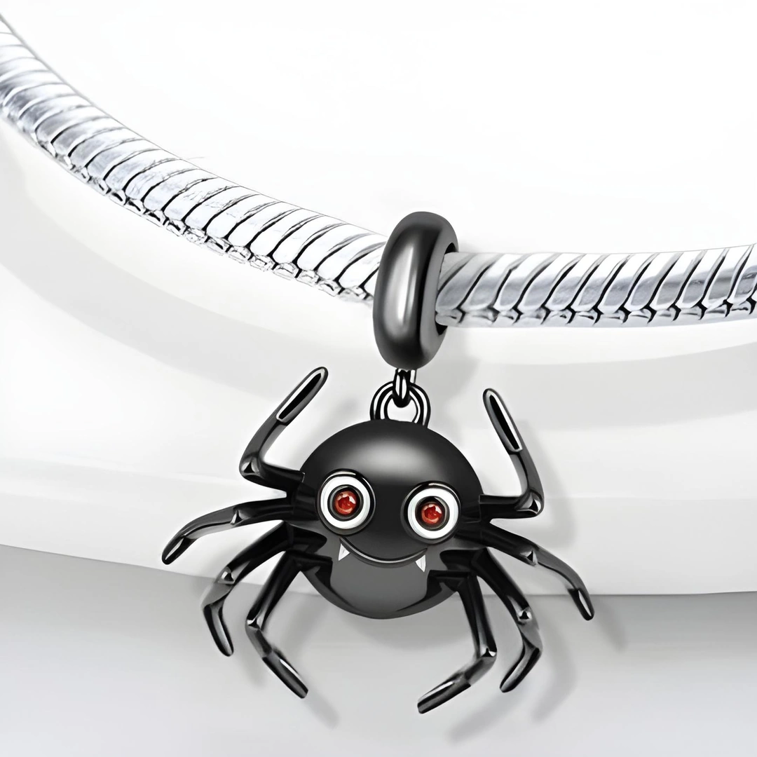 Une araignée noire au sourire énigmatique. Ses yeux rouges étincellent, suspendue entre mystère et élégance, prête à se glisser à votre cou ou poignet.