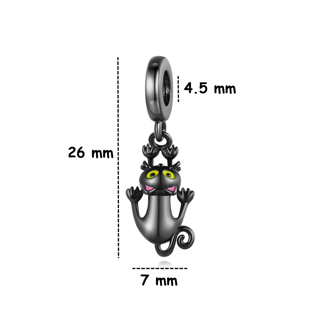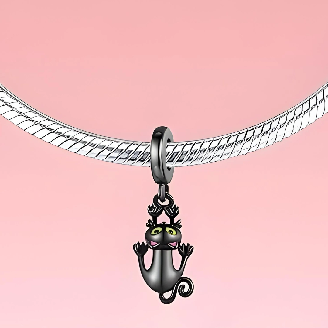 Suspendu dans un léger balancement, ce chat noir en argent veille sur vous : ses yeux jaunes brillent d’une détermination farouche et d’une magie discrète. À monter sur collier ou bracelet.