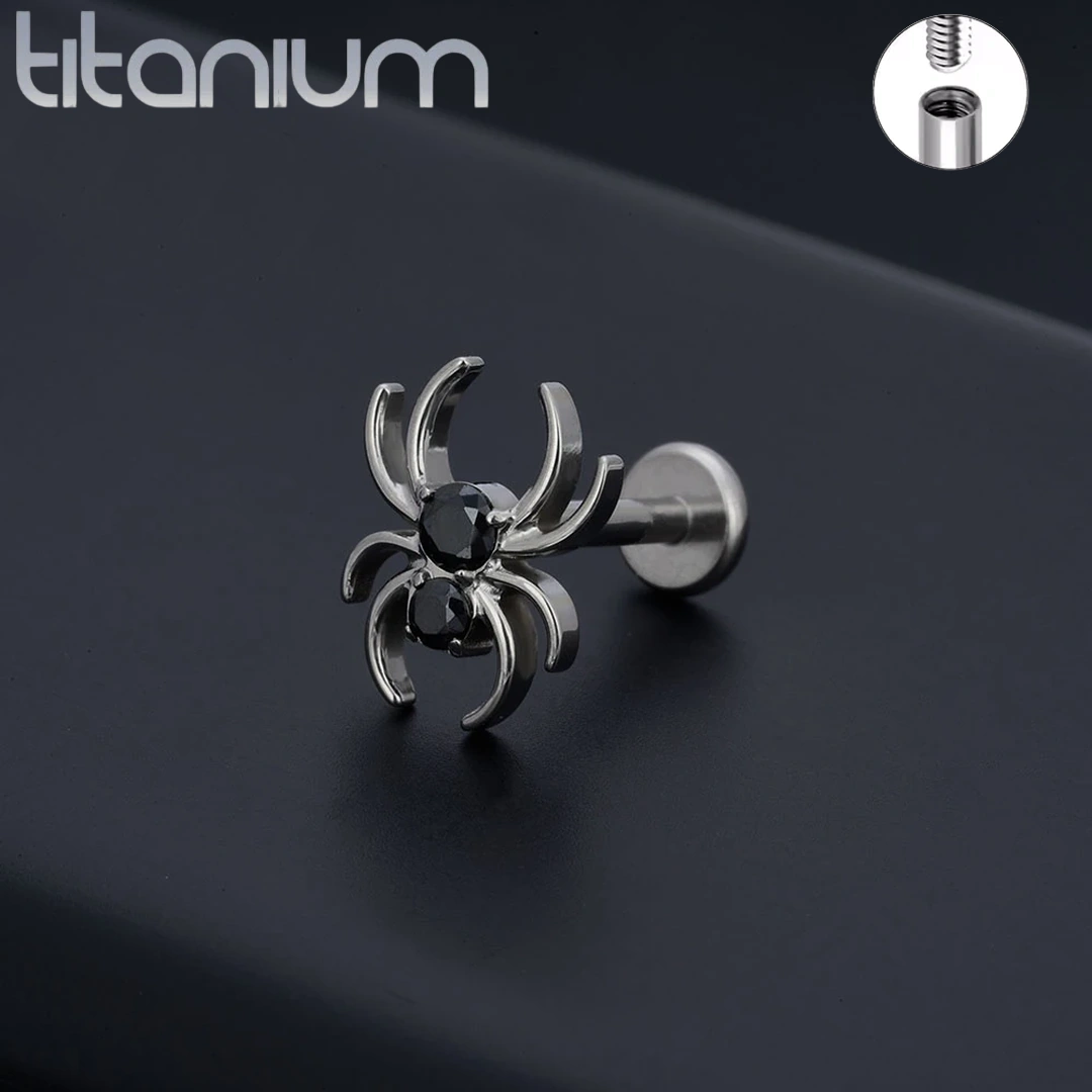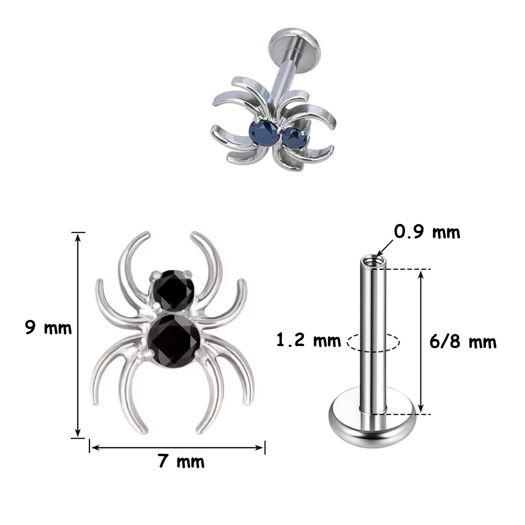 Piercing labret araignée en titane ASTM-F136, zircons noirs griffés. Filetage interne, 6 mm ou 8 mm. Idéal sur un tragus, compatible lèvre & cartilage.