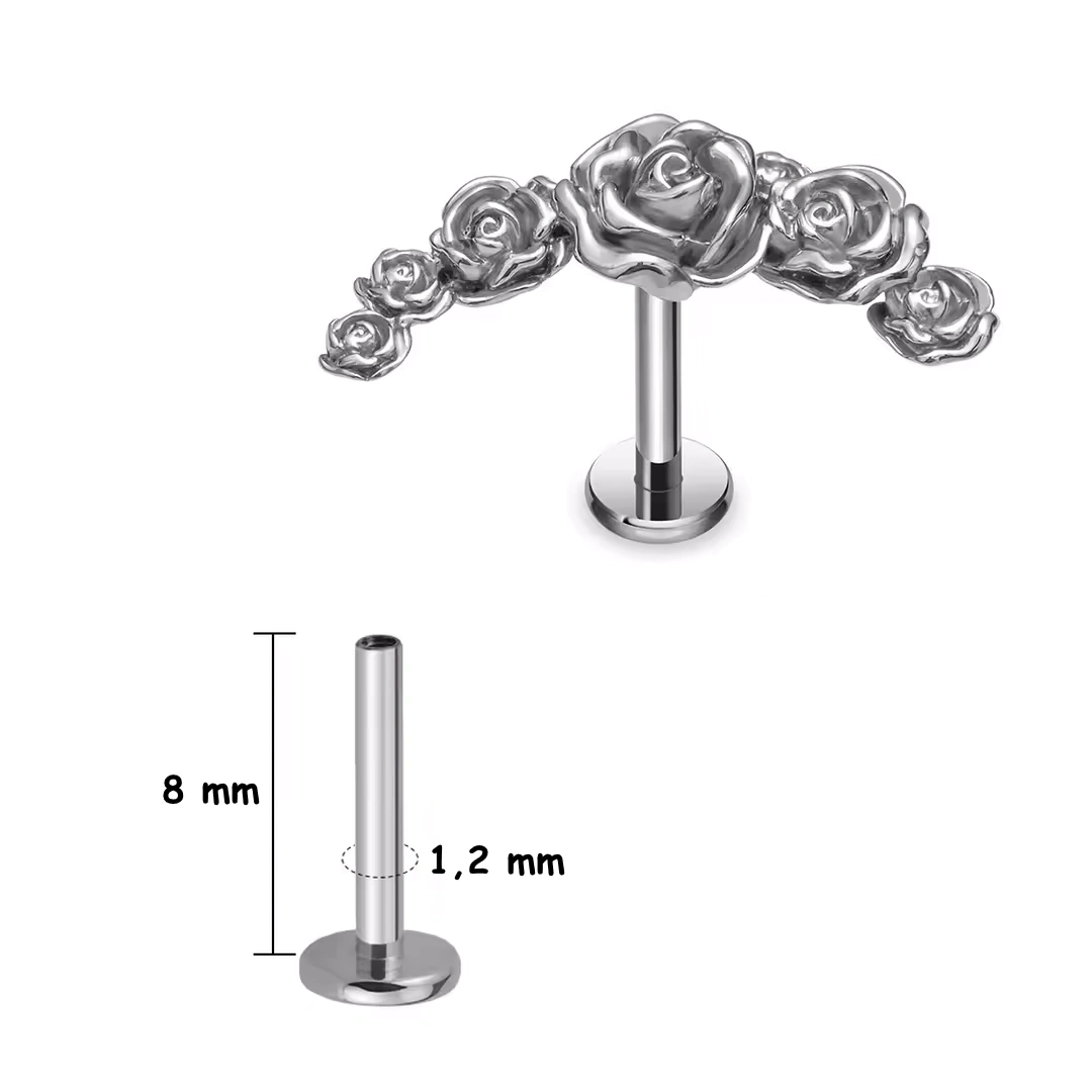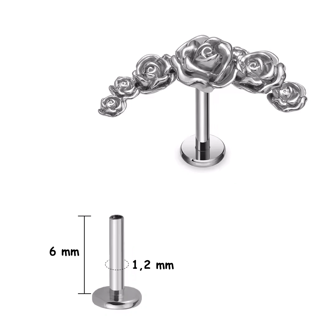 Piercing à tige labret en titane ASTM-F136 avec arc de roses sculptées. Filetage interne, longueurs 6/8 mm. Parfait pour flat, hélix, conch ou lobe.