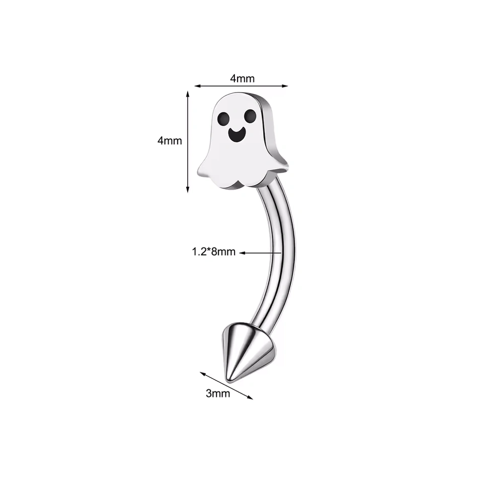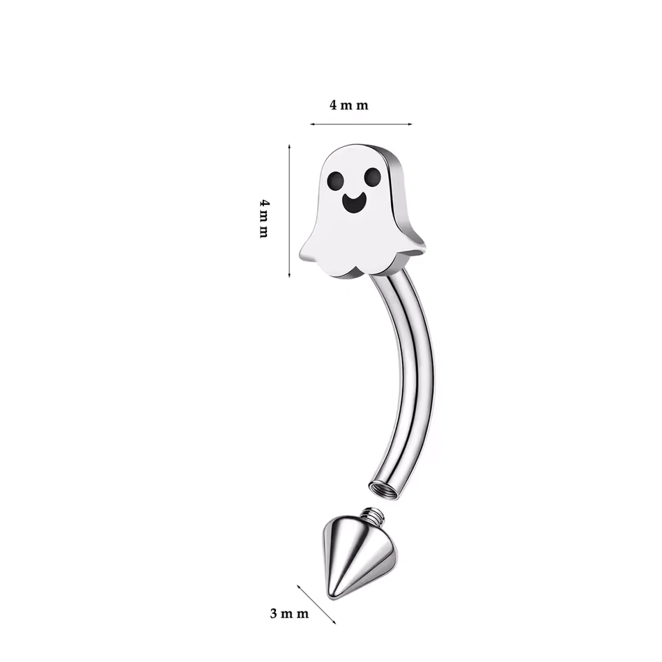Ce bijou se distingue par son design unique : un fantôme espiègle de 4×4 mm, affichant un large sourire malicieux, qui ajoute une touche ludique et mystérieuse à votre look. À l’autre extrémité, un spike au diamètre précis de 3 mm vient parfaire l’esthétique audacieuse du bijou, apportant une subtile note de caractère.