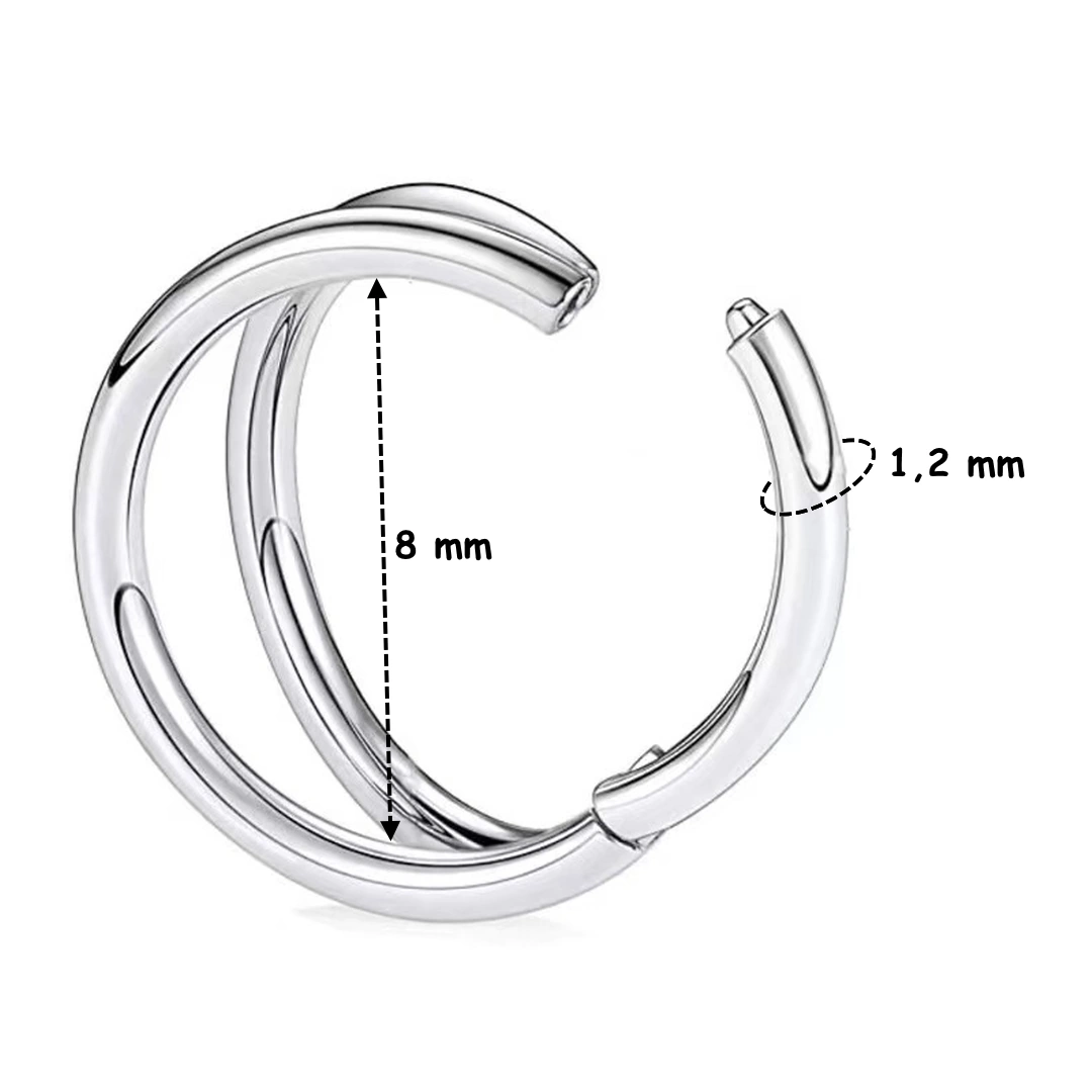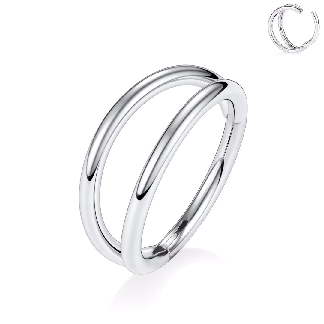 Double anneau de piercing clicker en titane ASTM-F136, diamètre interne 8 mm. Élégance affirmée pour lobe, cartilage oreille, septum, arcade ou lèvre.