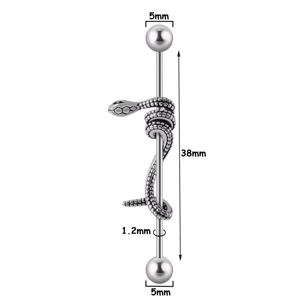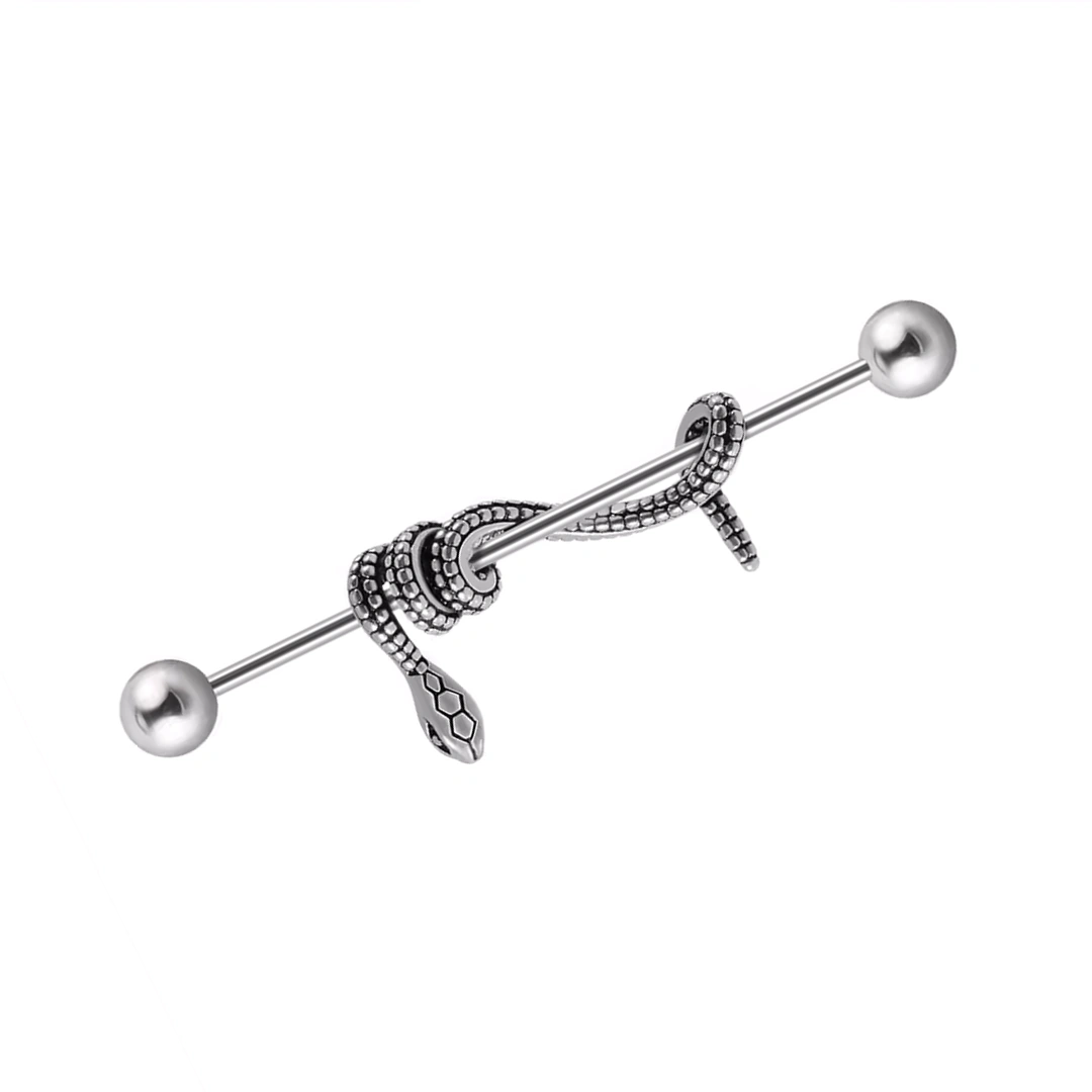 Succombez au charme hypnotique de ce piercing industriel serpent enroulé, une création qui conjugue symbolisme et esthétique intemporelle. Forgé en acier chirurgical, il associe robustesse et élégance, pour un bijou conçu autant pour sublimer votre style que pour durer dans le temps.