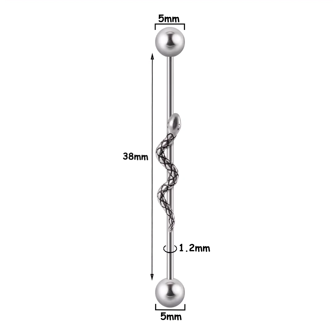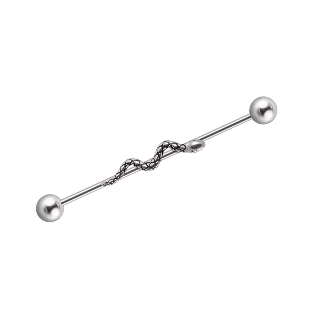 Ce piercing industriel en acier chirurgical dévoile un serpent majestueux rampant avec élégance le long de sa tige. Une symbiose parfaite entre robustesse et raffinement, ornée de deux billes brillantes. Vendu à l’unité