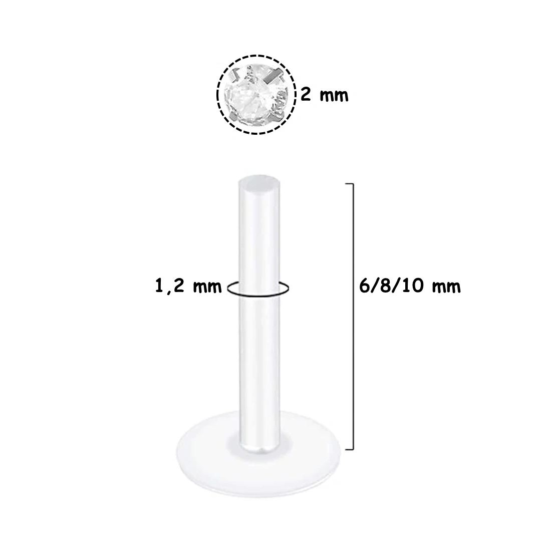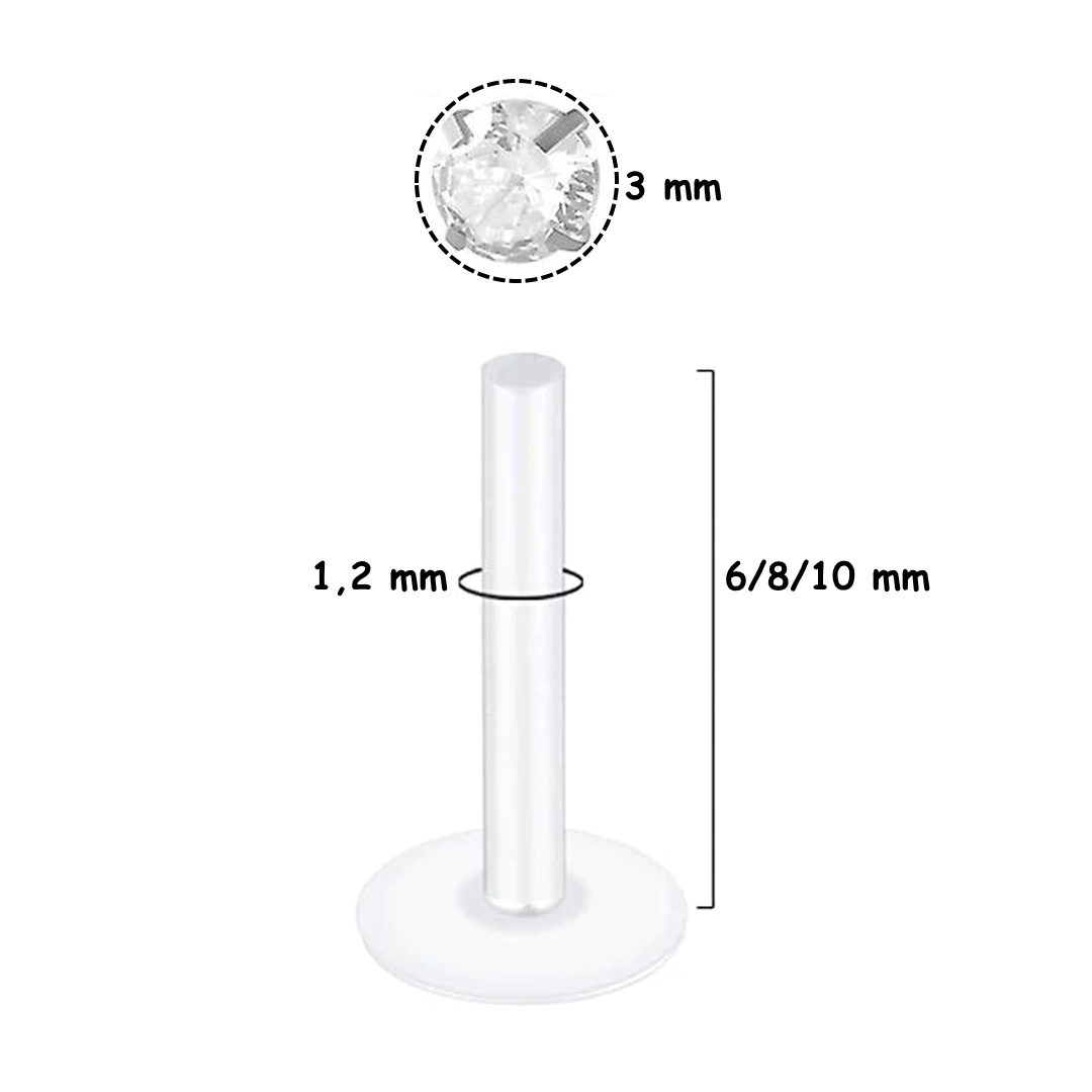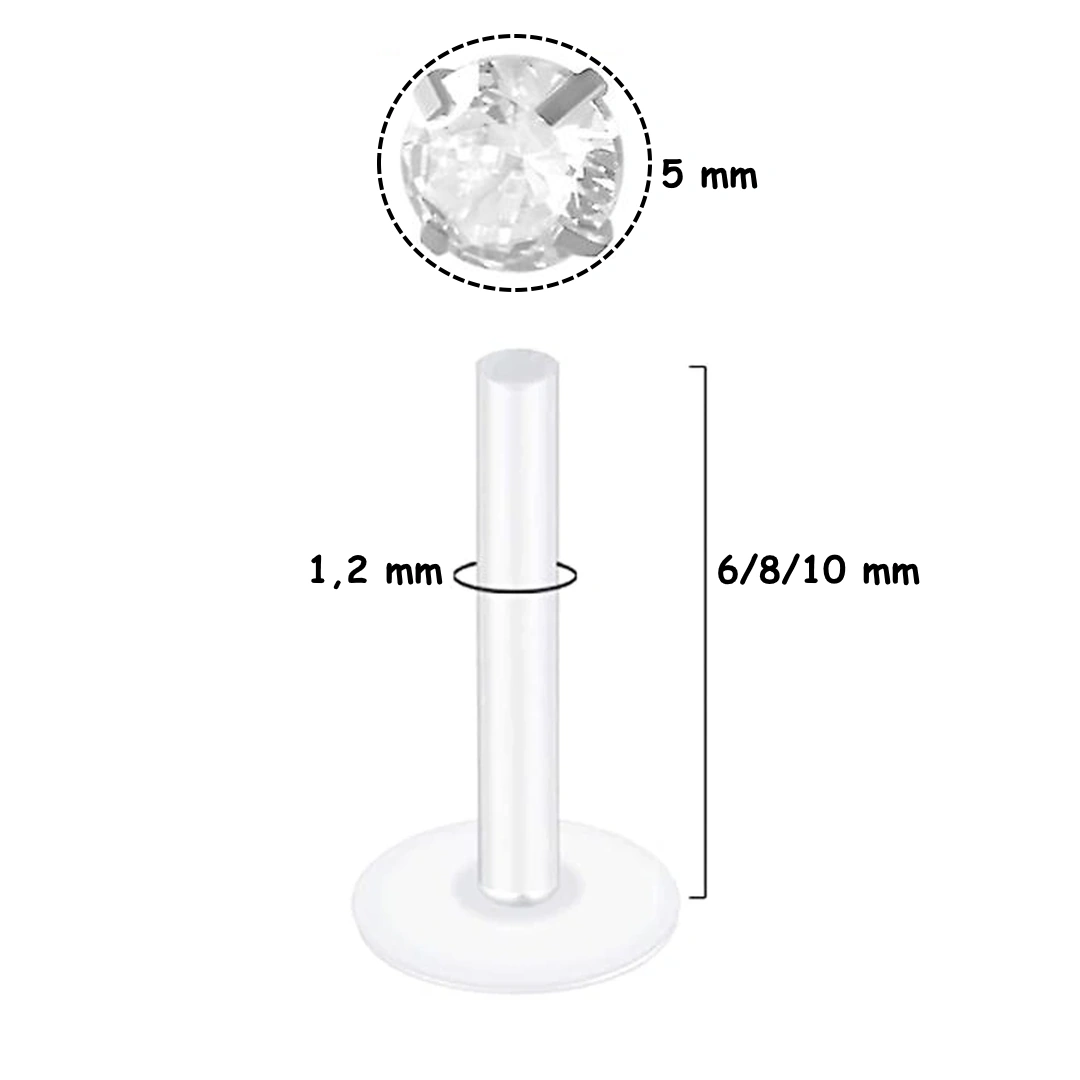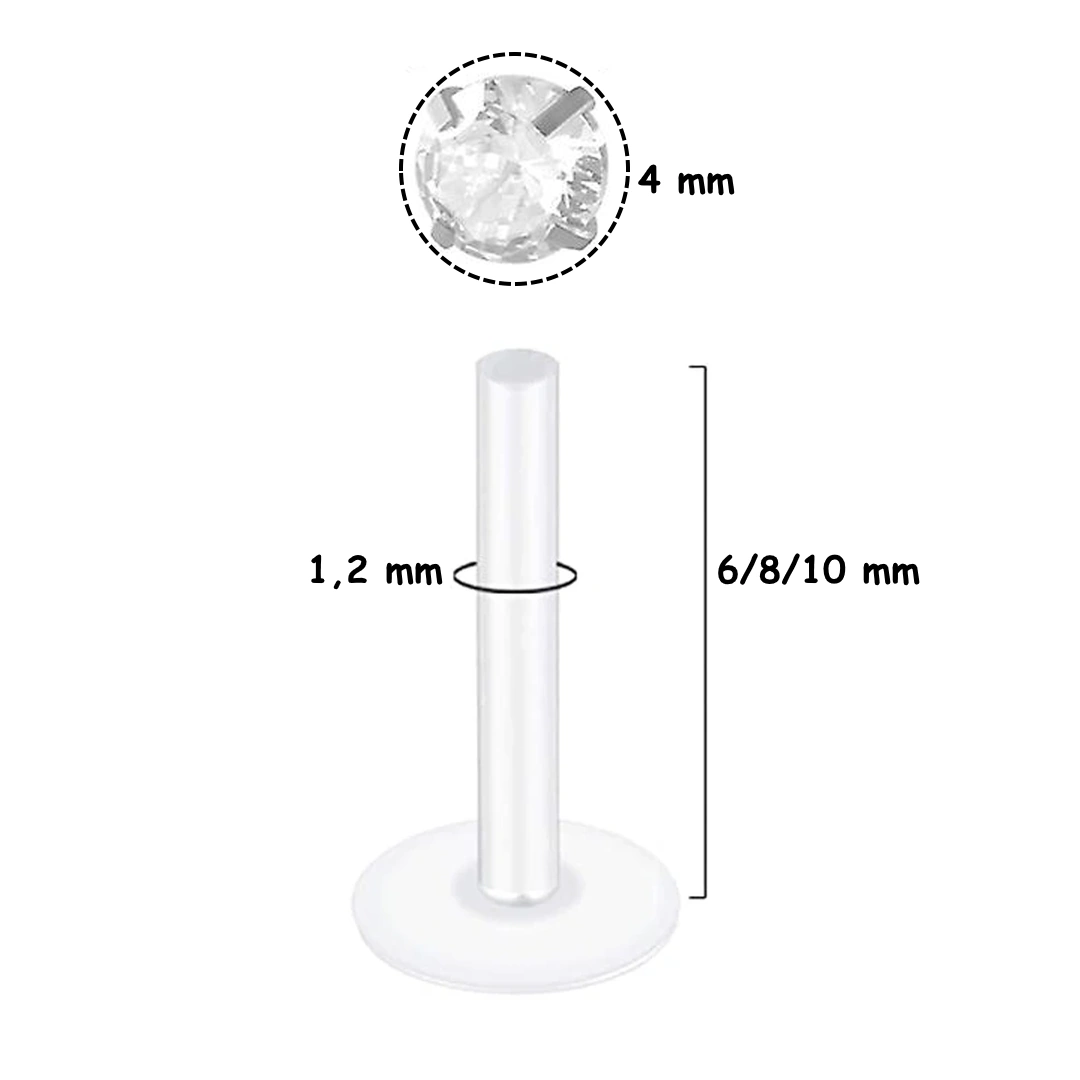 Piercing labret en Bioflex® souple avec zircon serti à griffes. Longueur 6–10 mm, zircon 2–5 mm. Idéal pour lèvre, lobe et cartilage.