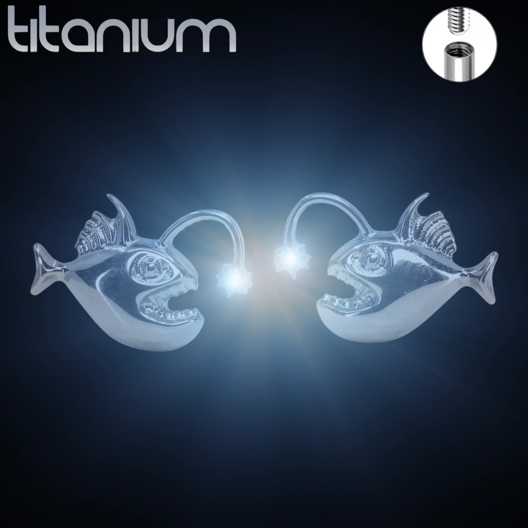 Un poisson lanterne en titane ASTM-F136, mystérieux et lumineux. Pour tragus, hélix, flat ou lobe. Tige labret 6 ou 8 mm, filetage interne.