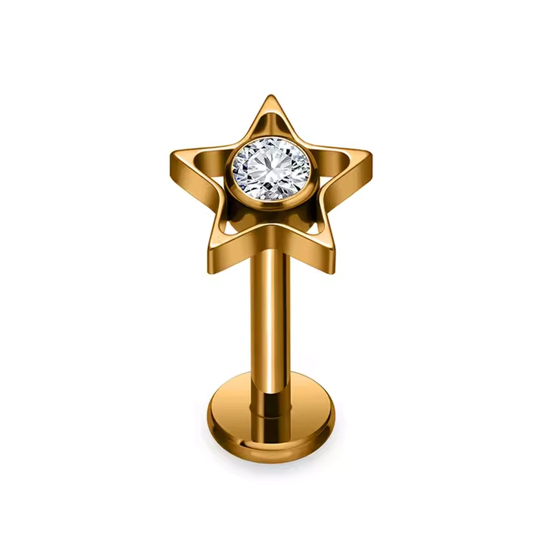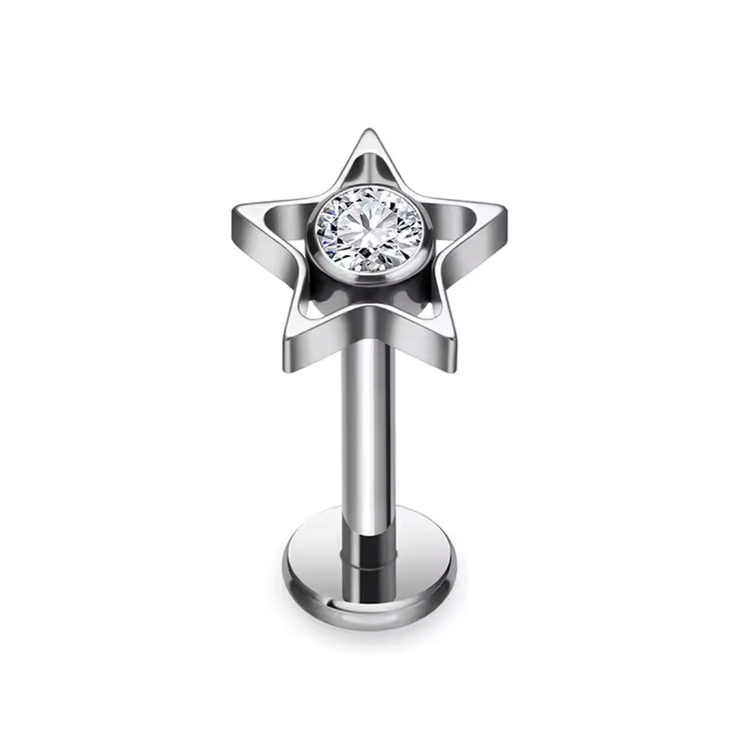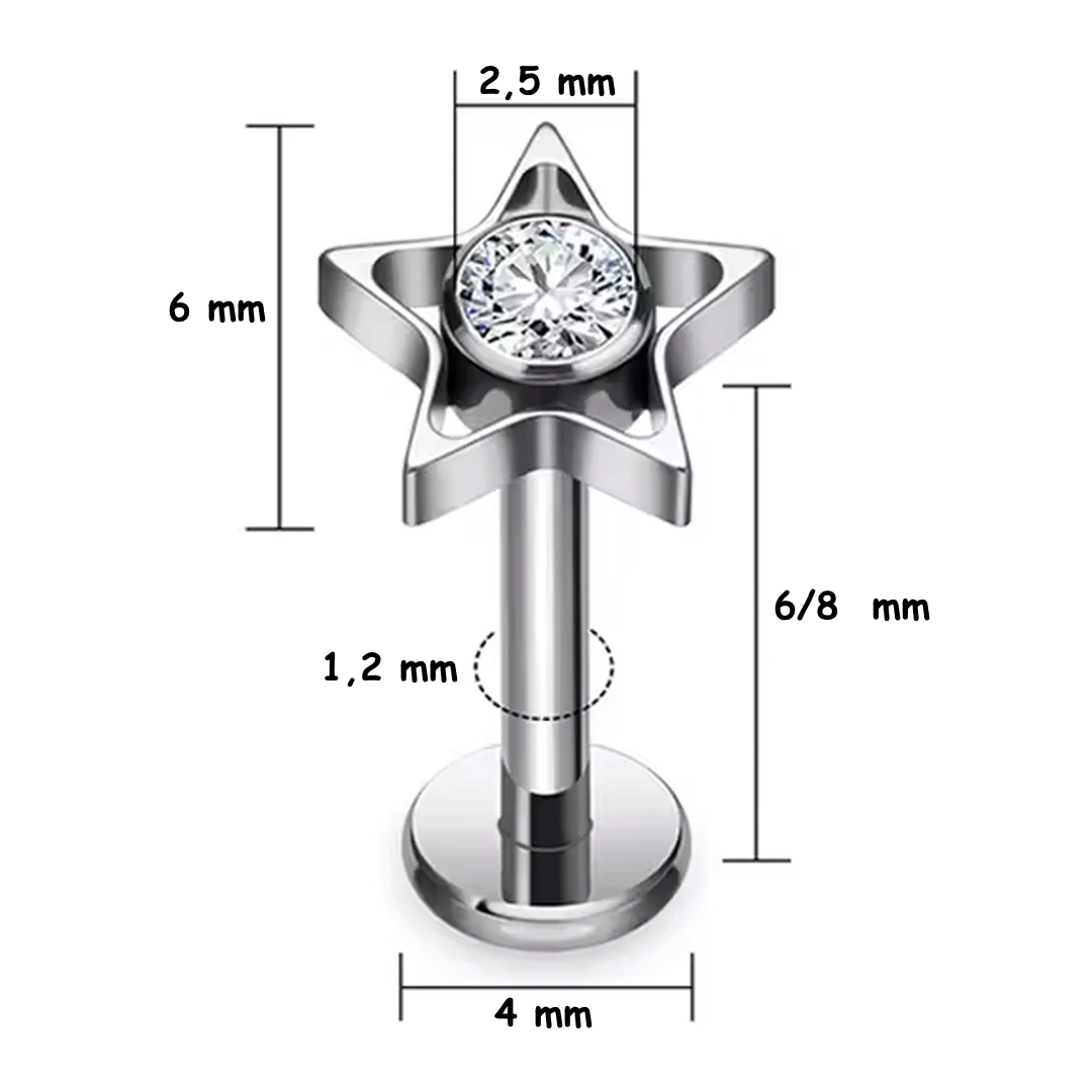 Piercing étoile ajourée en titane ASTM-F136, ornée d’un zircon. Labret droit, filetage interne, deux longueurs. Pour hélix, lobe, tragus ou lèvre.