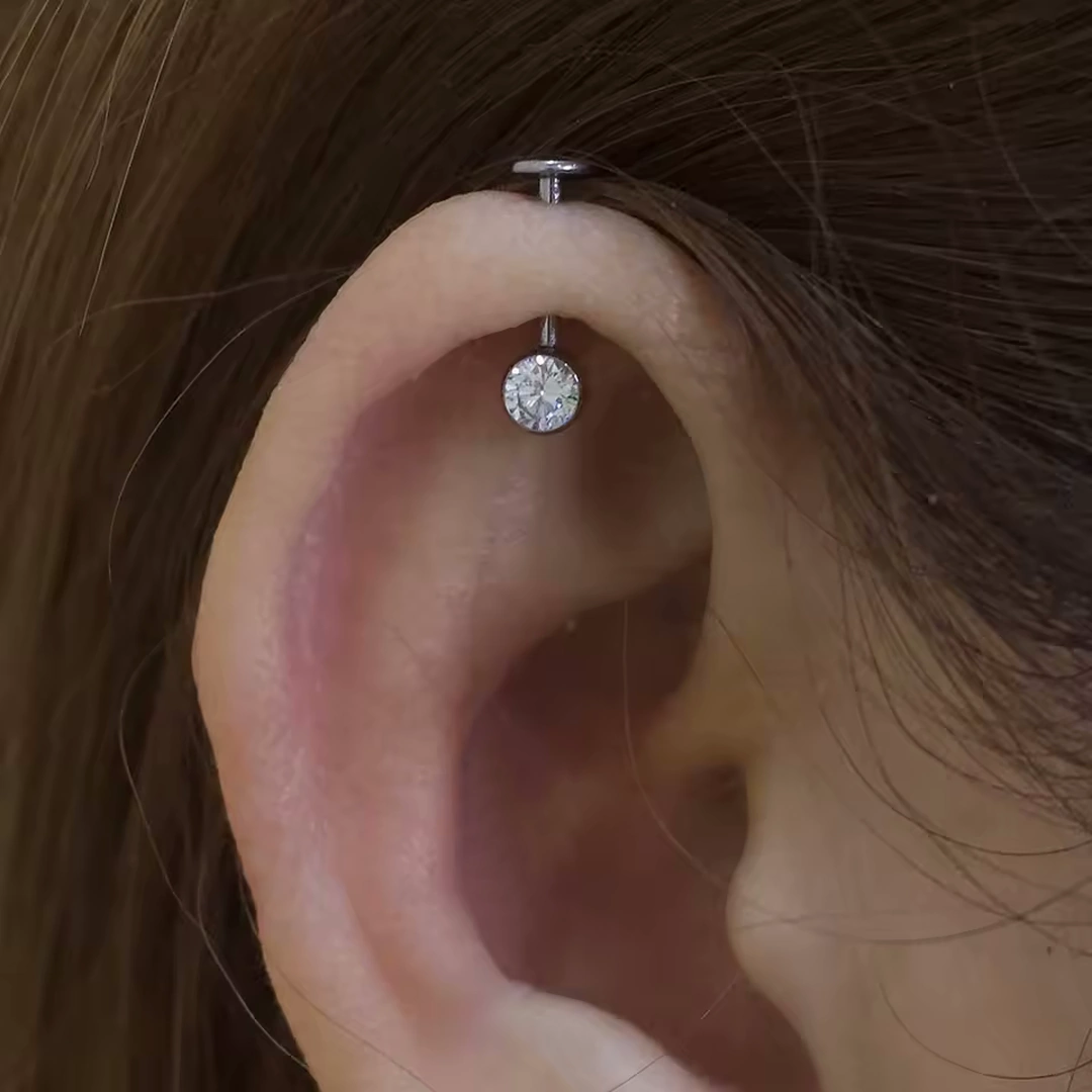 Sur l’hélix, il permet un montage original où l’embout vient se loger sous le pavillon tandis que la base plate (4 mm) reste visible au-dessus, pour un effet inversé élégant et unique.