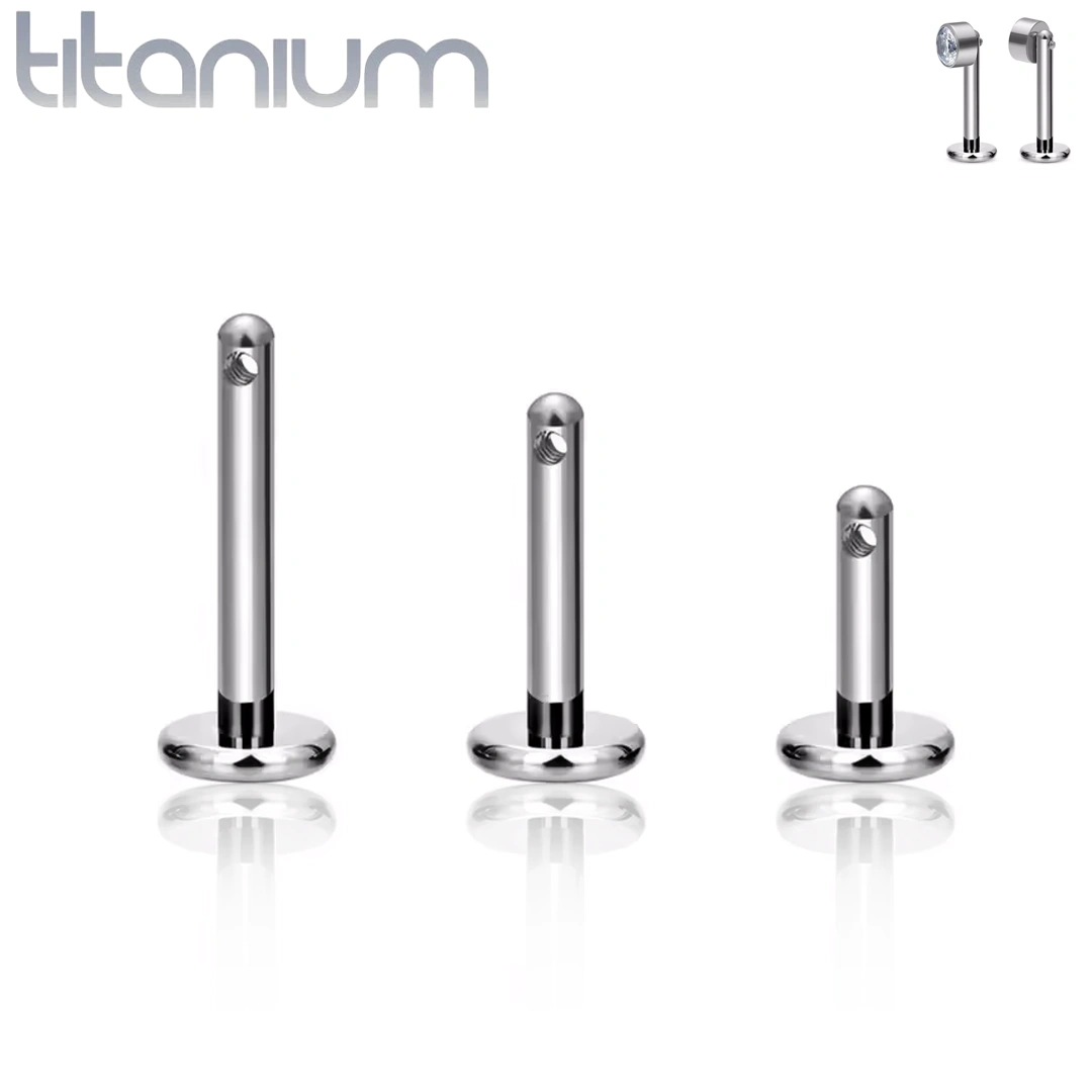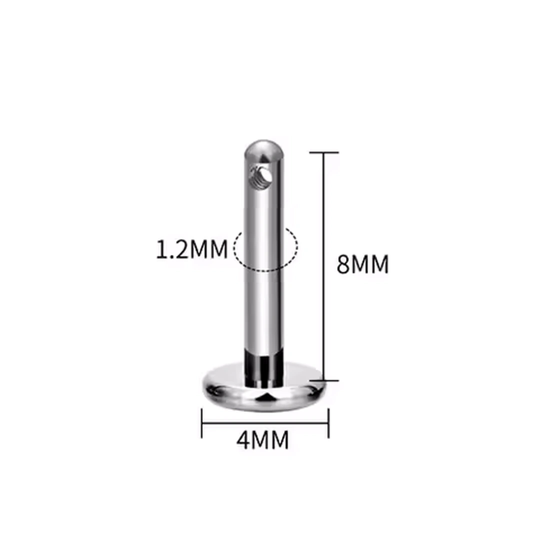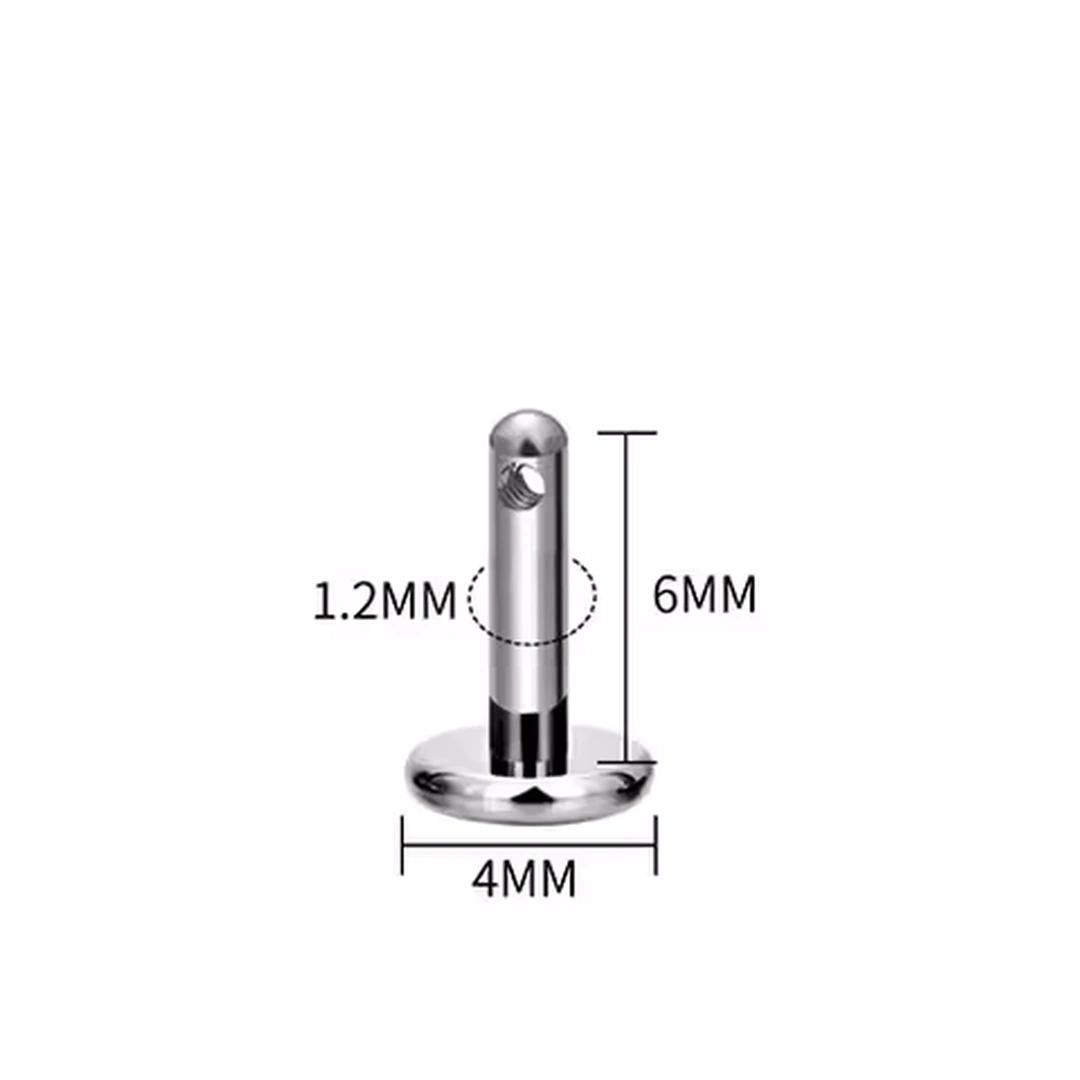 Labret à filetage interne latéral en titane ASTM-F136. Design plat et discret, idéal pour cartilage (hélix) et lèvre. Longueurs 6, 8 ou 10 mm.