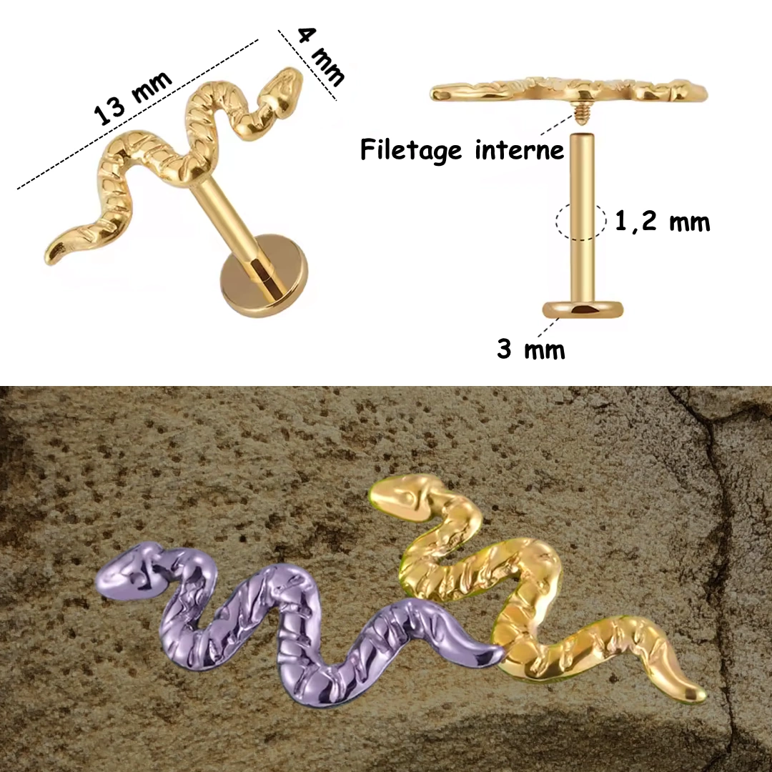 Piercing labret en titane ASTM-F136 à motif serpent réaliste et texturé, pour cartilage (hélix, tragus, conch) ou lèvre. Élégance et robustesse.