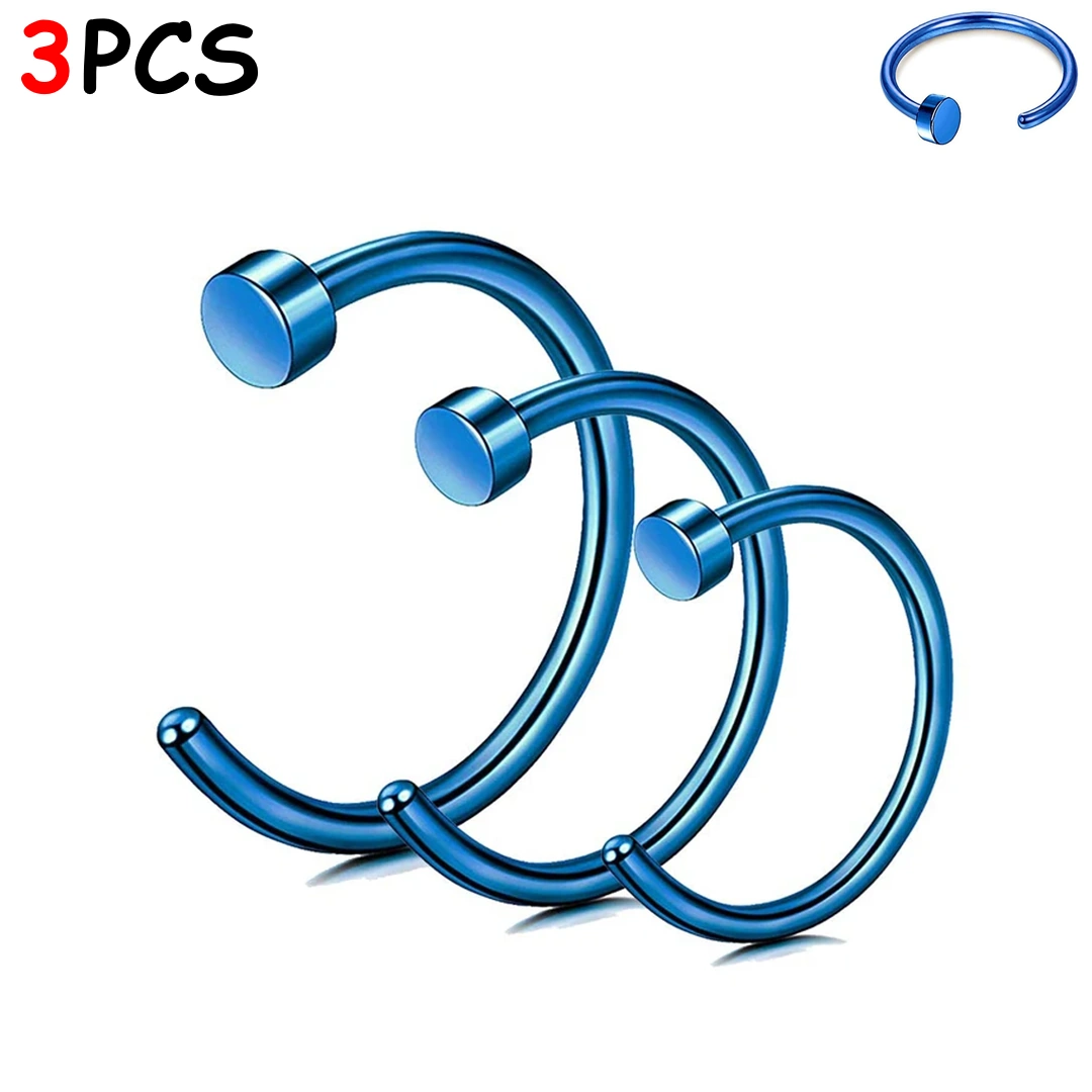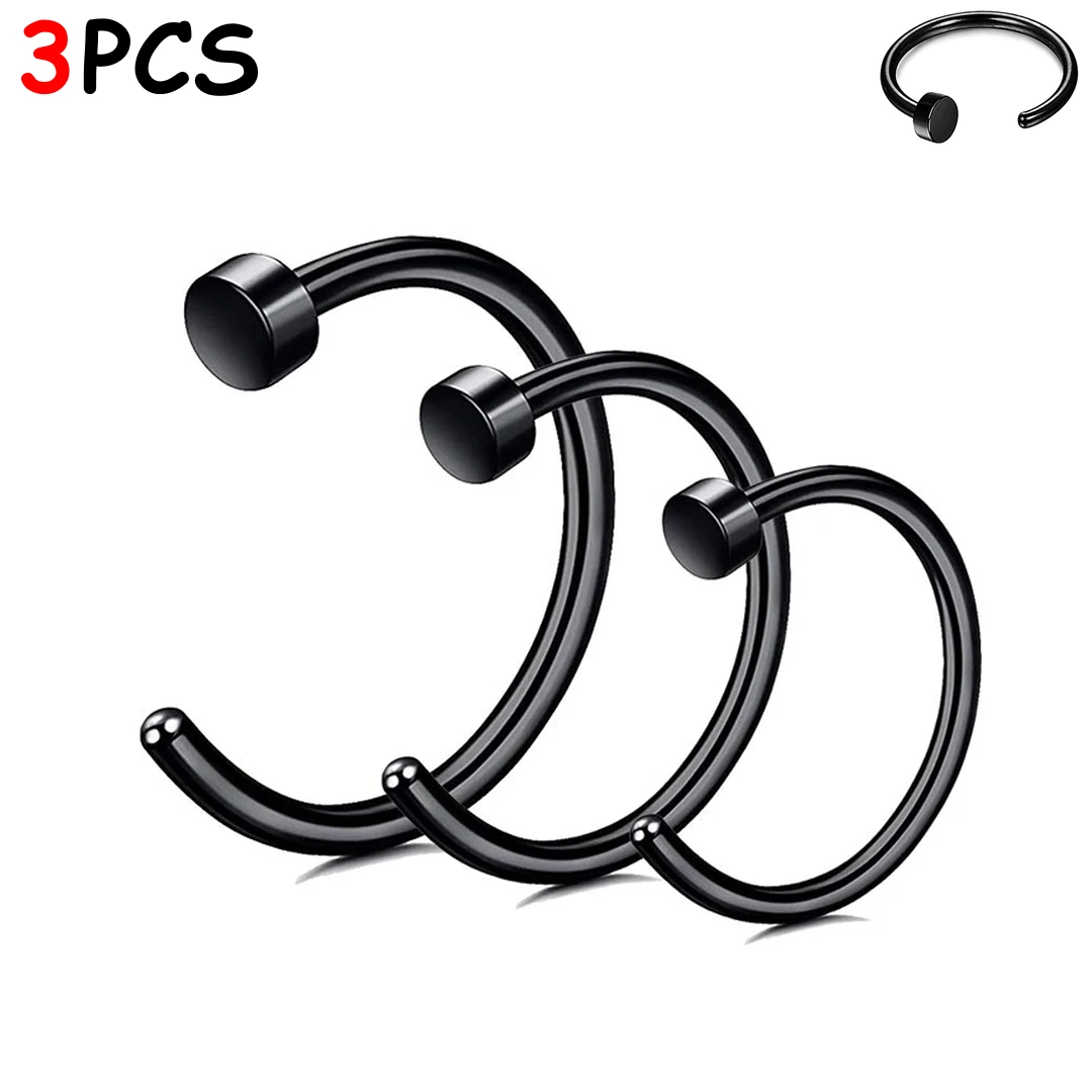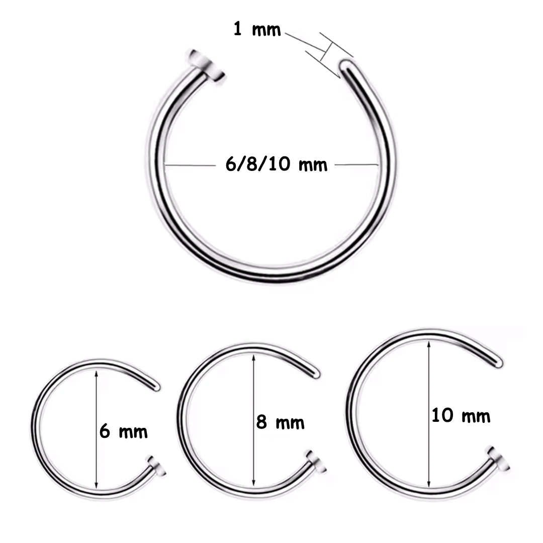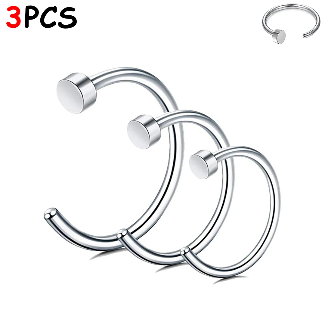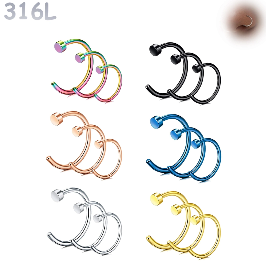 Anneau ouvert de narine en acier 316L avec disque de butée, finitions poli ou PVD. Lot de 3 tailles pour un confort durable et un ajustement sur mesure.