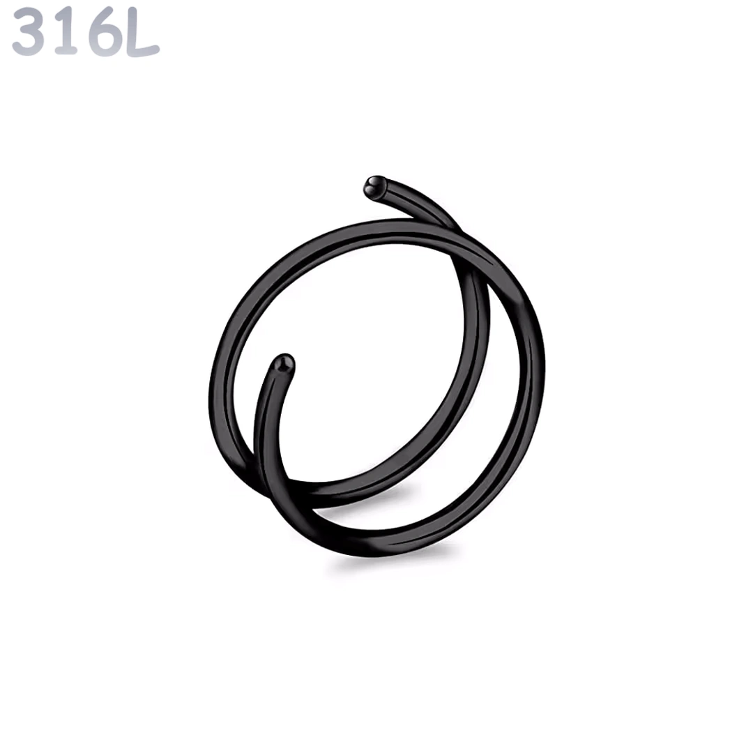 Ce piercing nostril en acier 316L dessine un élégant double anneau autour de la narine. Son design en spirale crée l’illusion de deux anneaux parfaitement alignés, tout en ne nécessitant qu’un seul piercing.