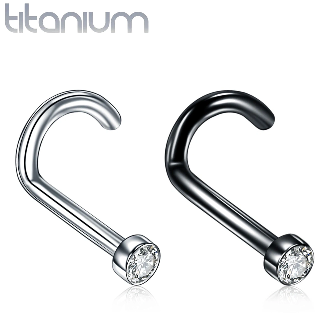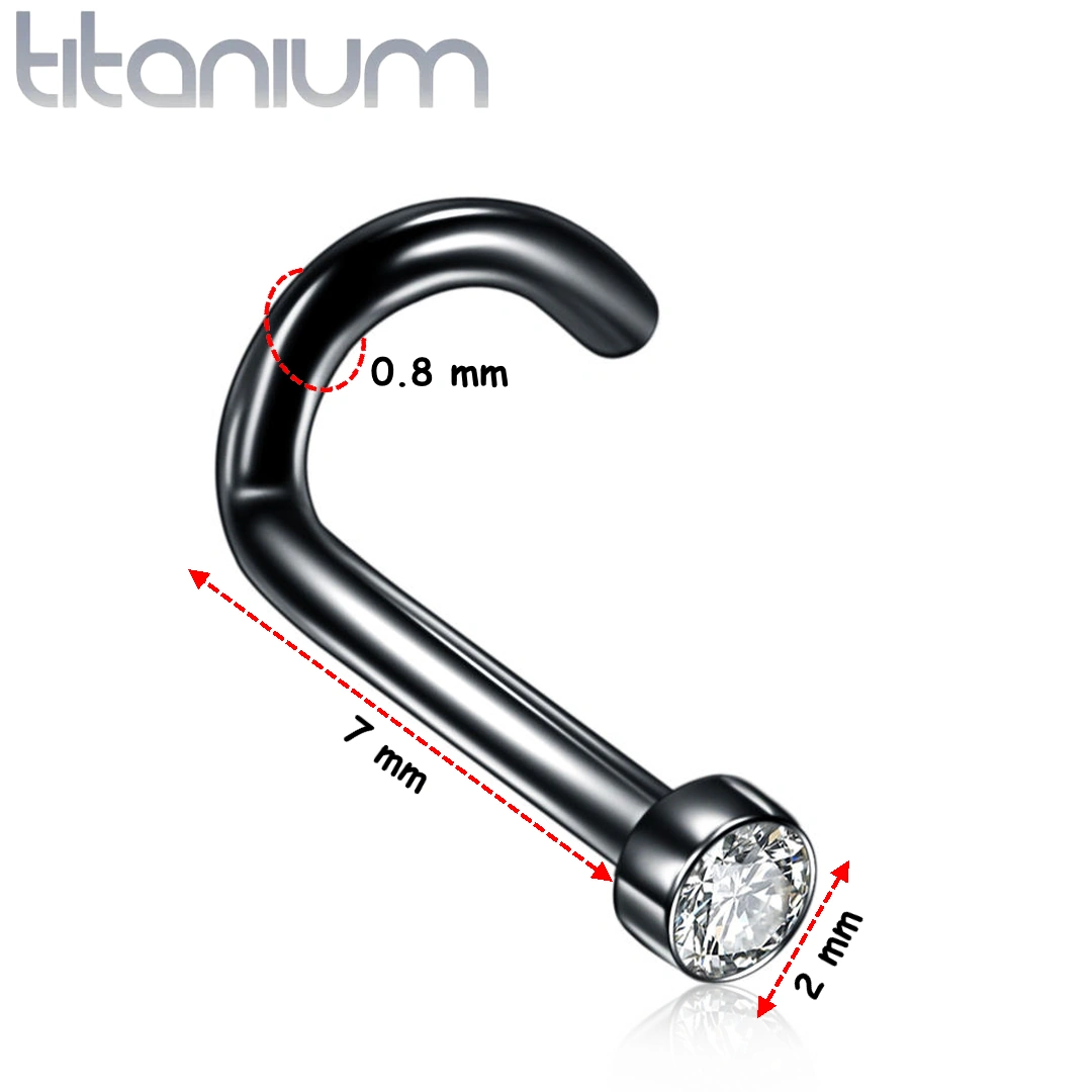 Ce stud courbé pour piercing nostril conjugue la profondeur du titane anodisé noir ou la pureté du titane poli à la brillance cristalline d’un zircon cubique de 2 mm, serti directement dans le métal pour une finition nette, durable et parfaitement lisse.