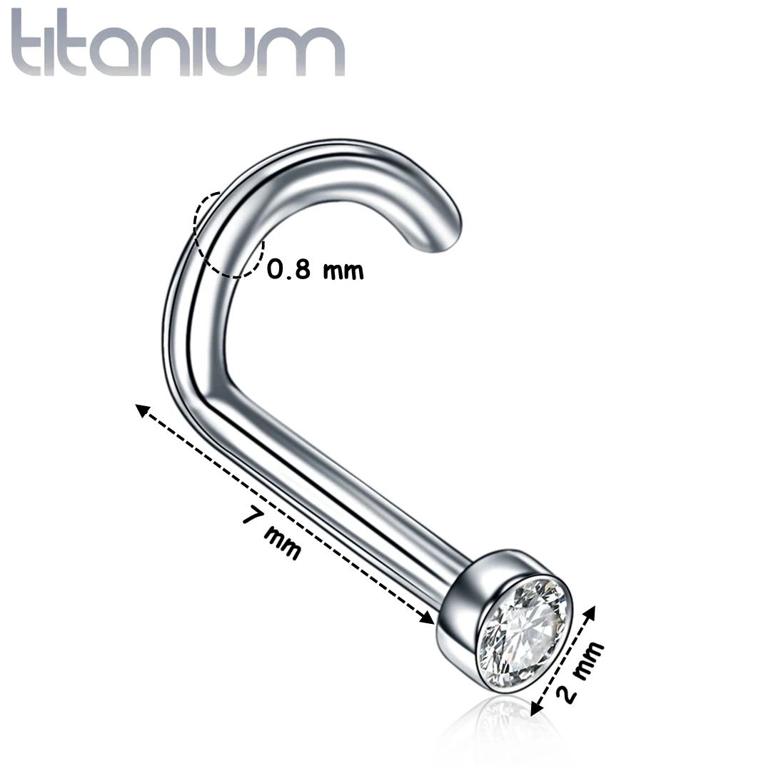 Stud courbé pour piercing narine en titane ASTM-F136, façade cylindrique sertie d’un zircon 2 mm. Tige 0,8 mm, longueur 7 mm. Finition polie ou anodisée noir.