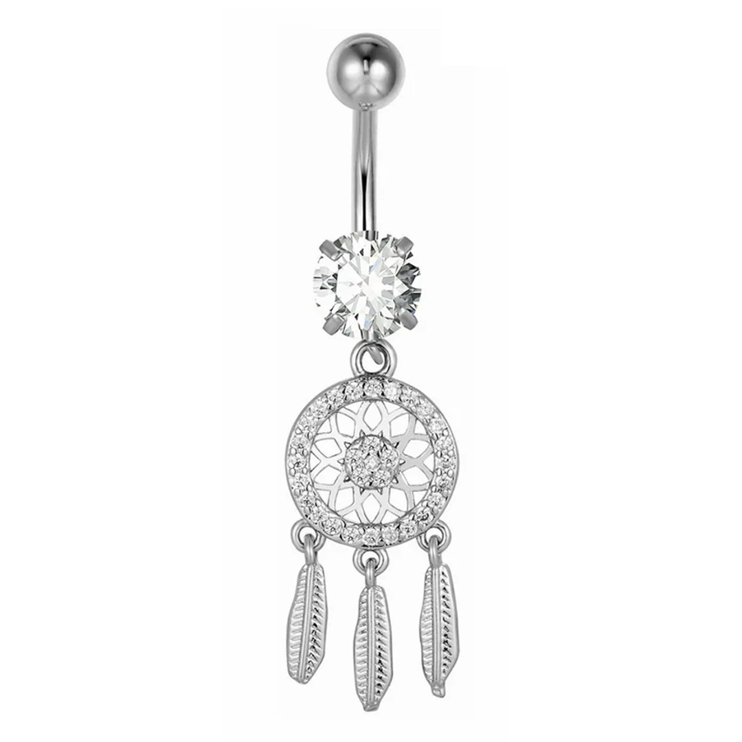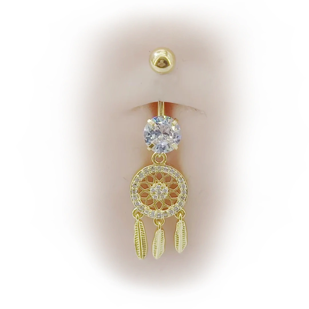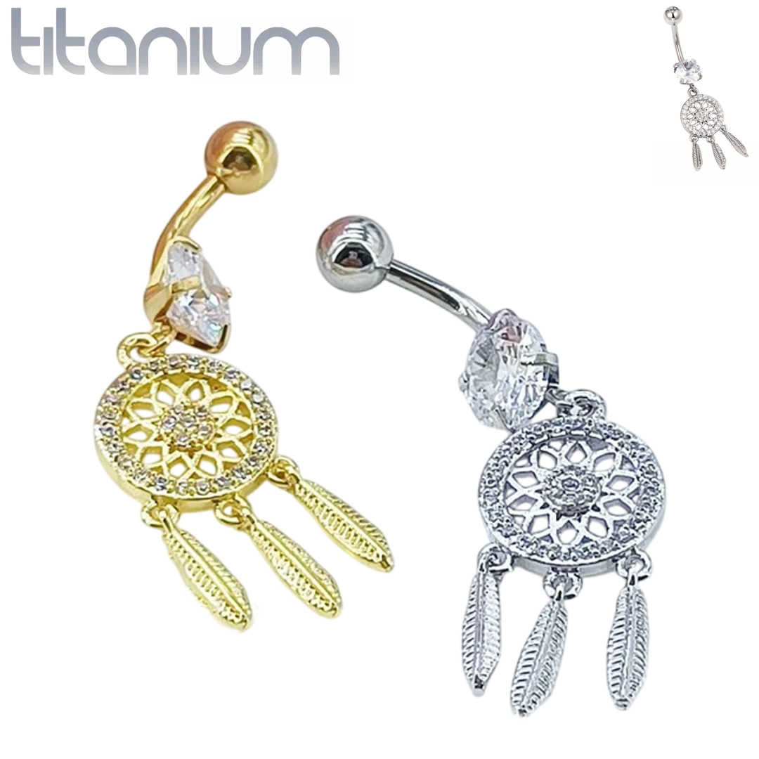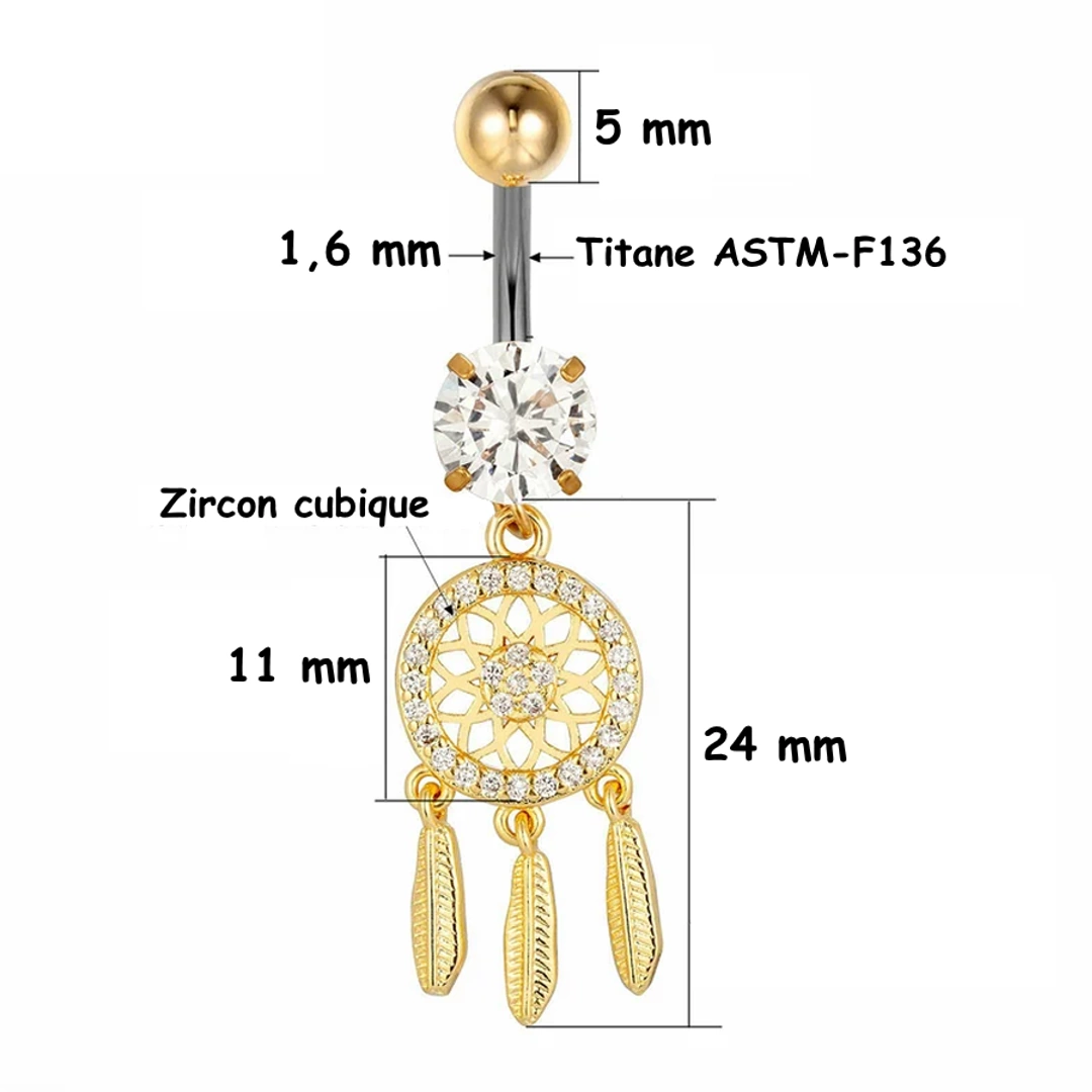 Piercing nombril en titane brut ou anodisé doré, pendentif attrape-rêves à plumes serti de zircons lumineux. Élégance, symbolique et éclat unique.