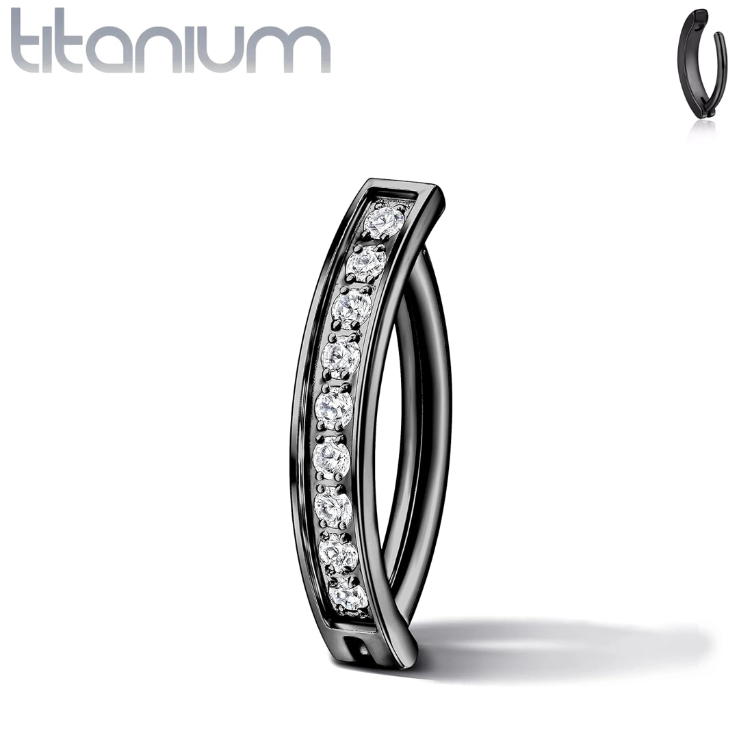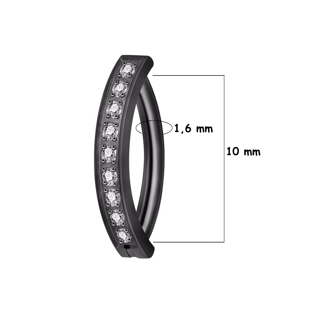 Piercing nombril anneau clicker semi-plat en titane anodisé noir, barrette courbée avec 9 zircons étincelants. Élégance sombre et confort assuré.