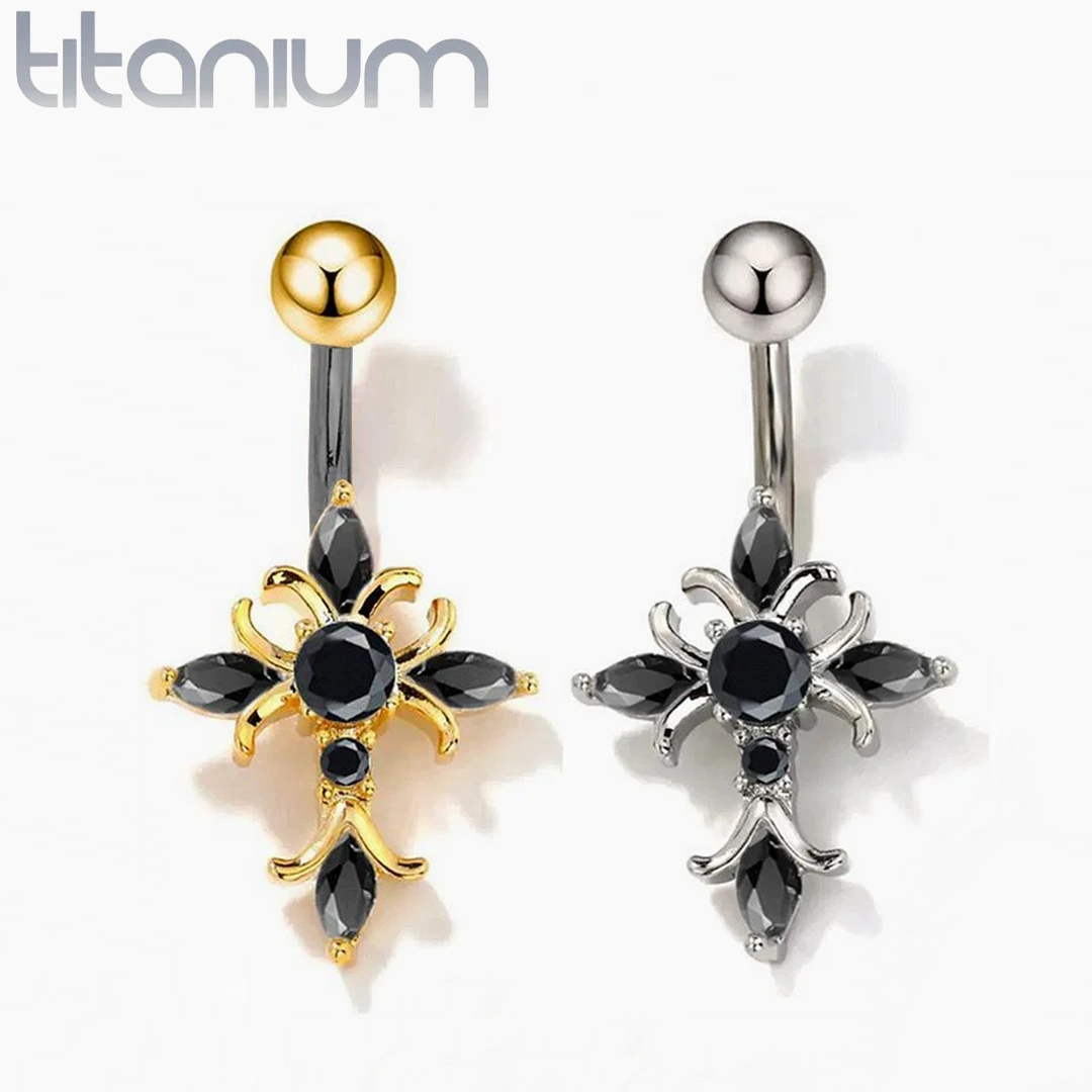 Piercing nombril en titane ASTM-F136 teinte naturelle ou anodisé doré, orné d’une croix scintillante de zircons noirs – élégance mystique et confort absolu.