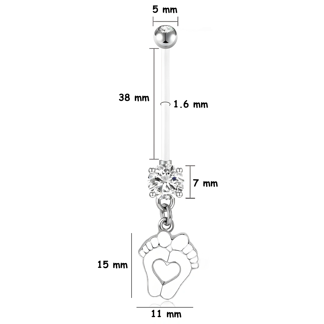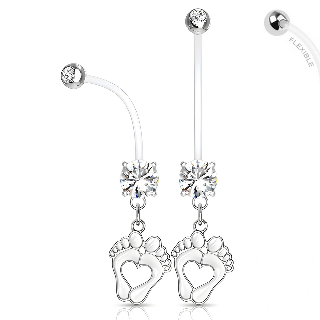 Bijou de piercing pour nombril, à porter en période de grossesse. Tige bioflex 38 mm ornée de zircons, avec pendentif pieds de bébé formant un cœur.
