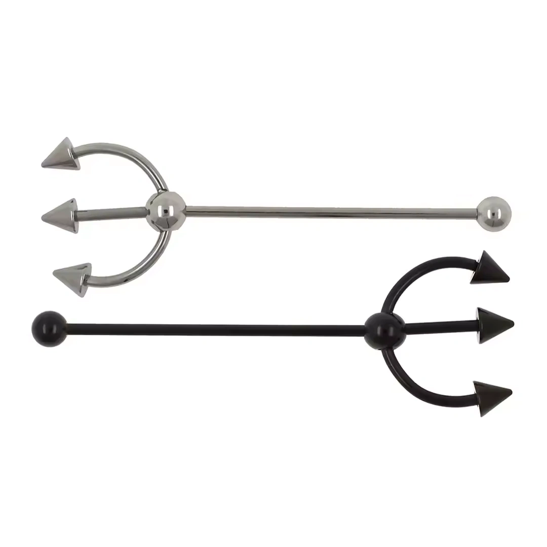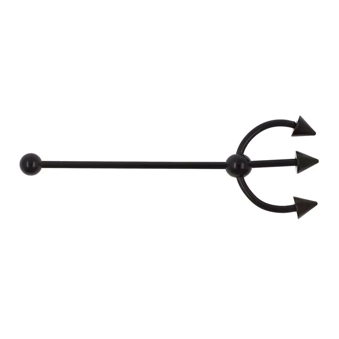 Affirmez votre style avec ce barbell industriel Trident en acier chirurgical. Trois spikes audacieux de 5 mm ornent ses extrémités, incarnant force et caractère. Disponible en acier naturel ou noir profond, il sublime chaque oreille d’une allure résolument rebelle. Vendu à l’unité