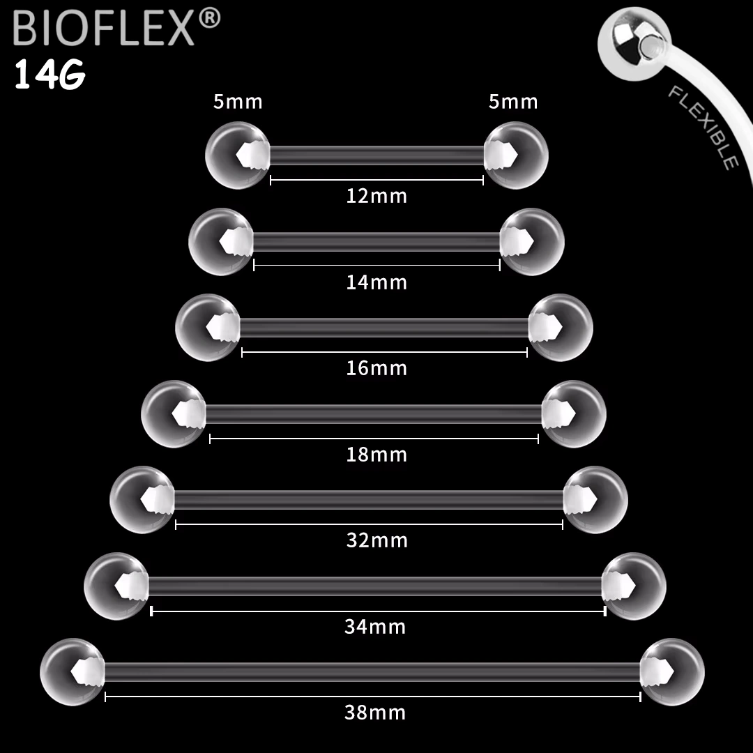 Barbell retainer Bioflex® 14G transparent, idéal pour cacher un piercing téton, langue ou industriel. Confort, discrétion et souplesse au quotidien.