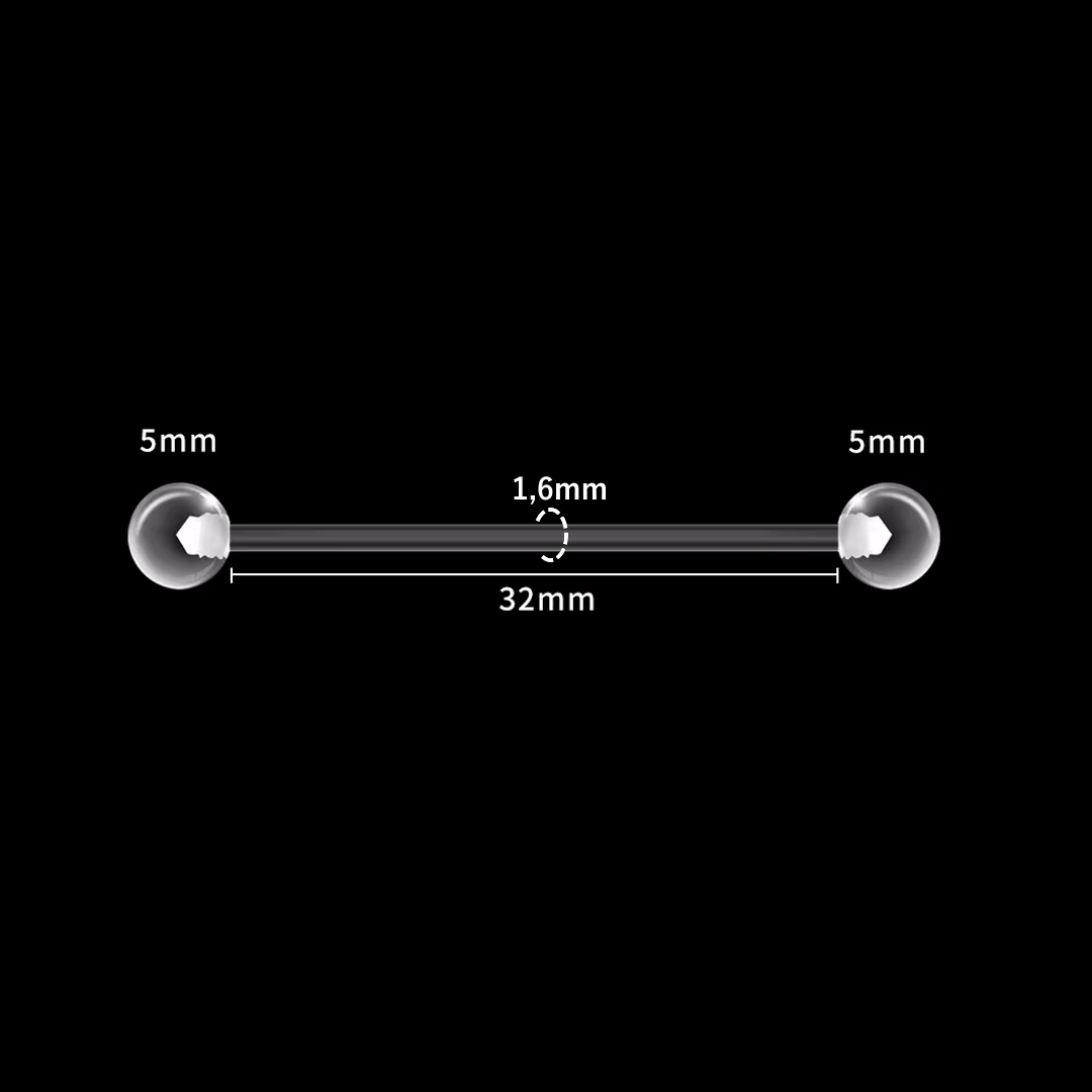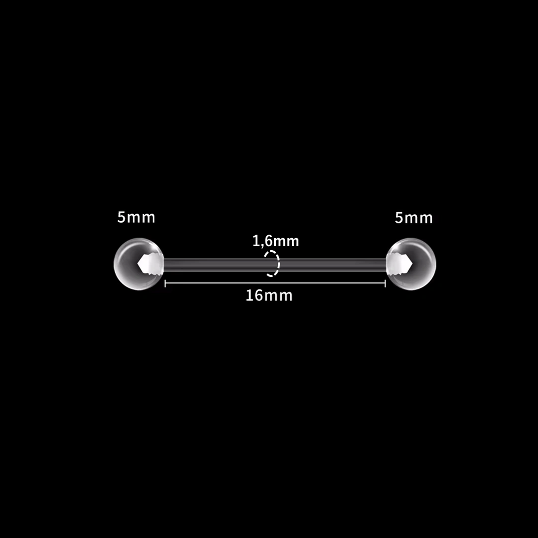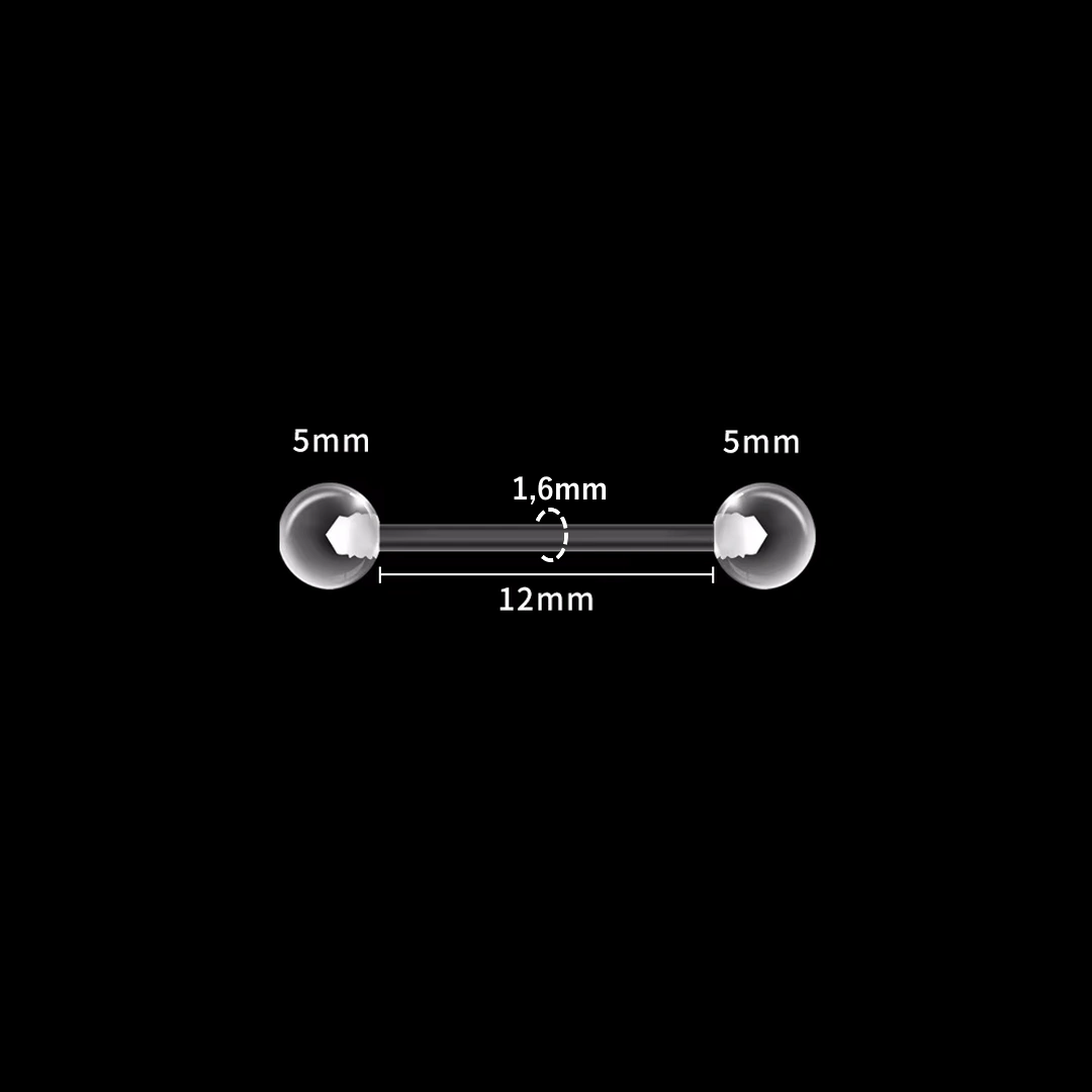La tige intègre un filetage externe 1,2 mm à chaque extrémité, assorti de billes transparentes de 5 mm, assurant un maintien sûr tout en restant totalement discret.