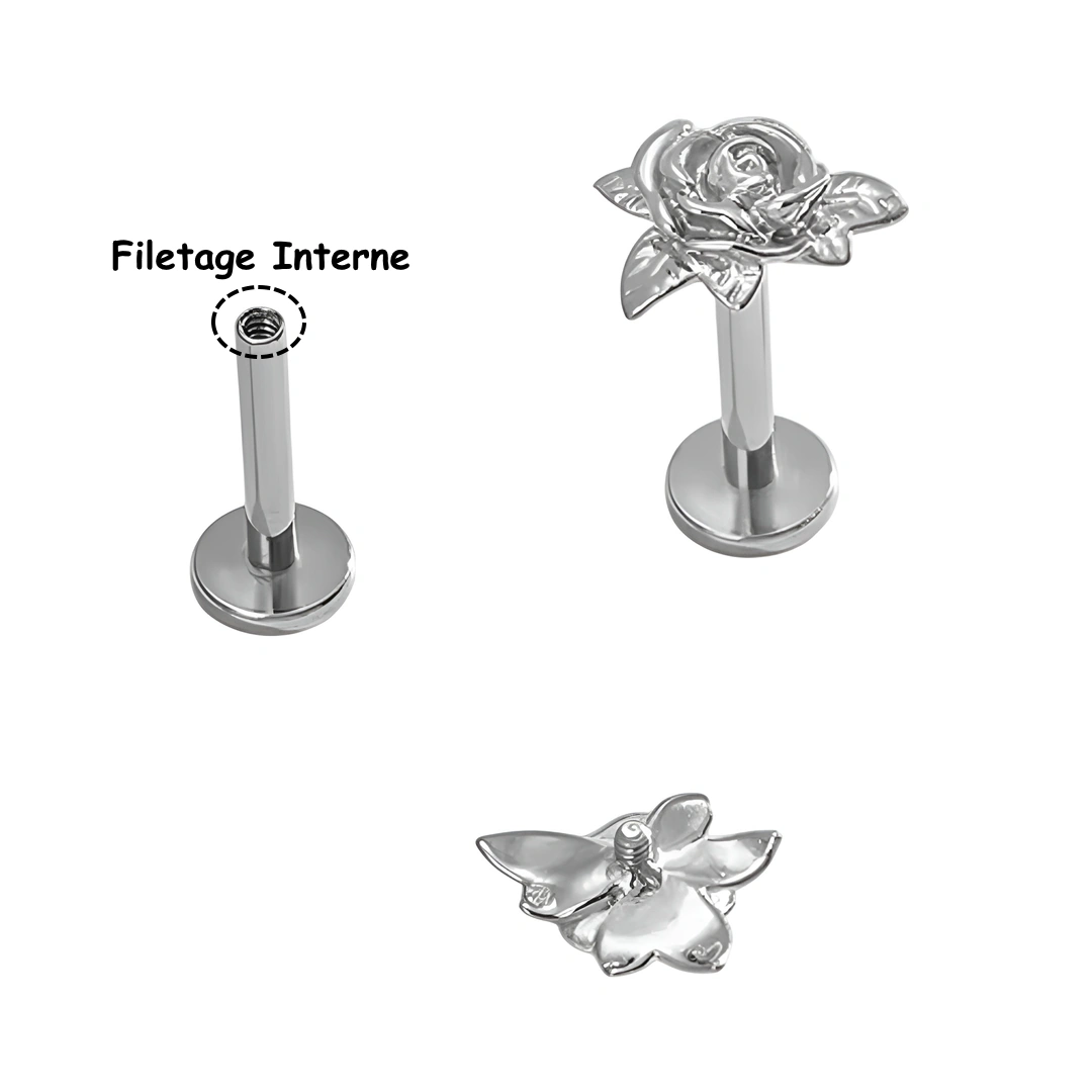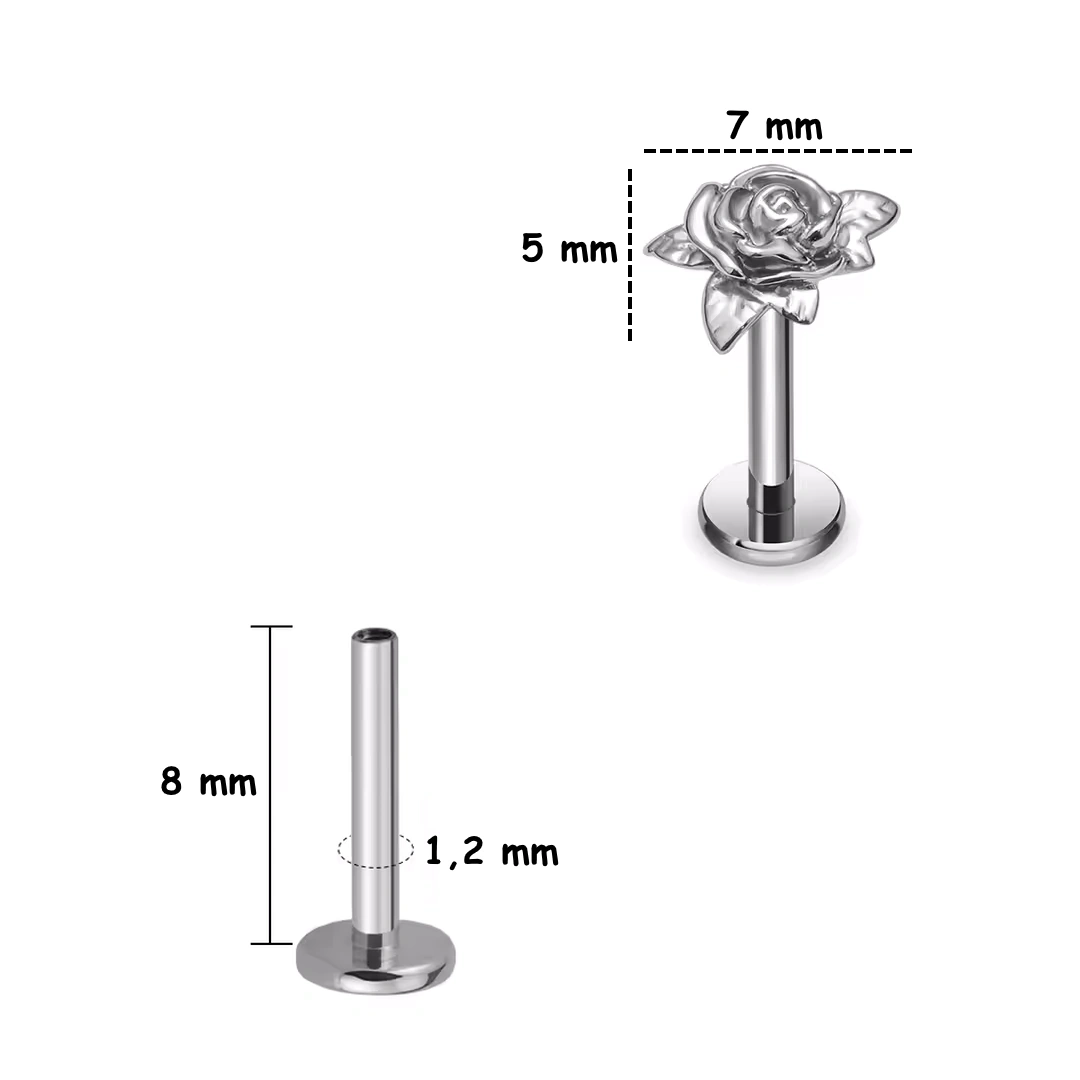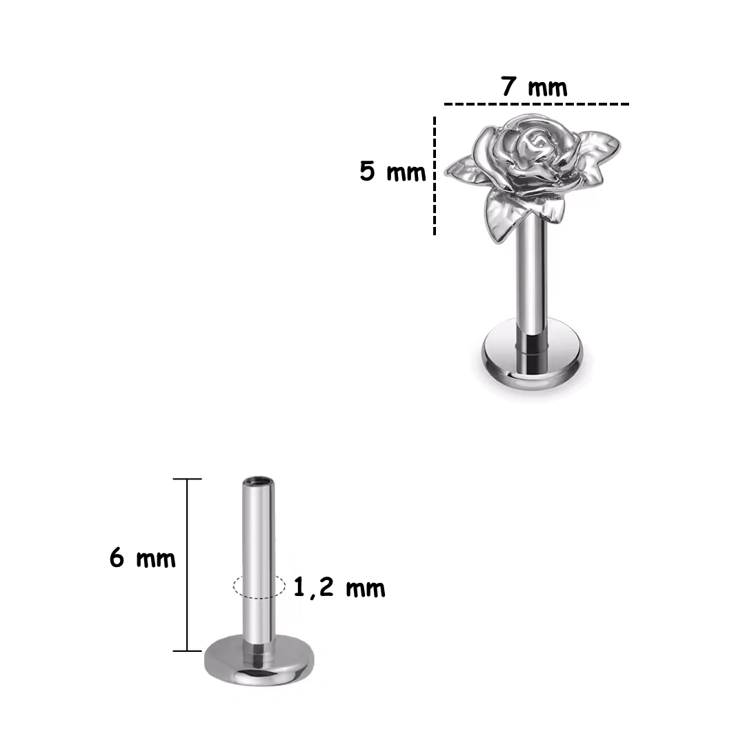 Piercing labret en titane ASTM-F136 avec rose sculptée. Filetage interne 1,2 mm, longueurs 6/8 mm. Idéal lobe, hélix, flat, tragus et madonna.