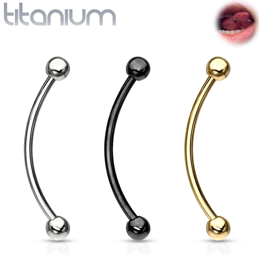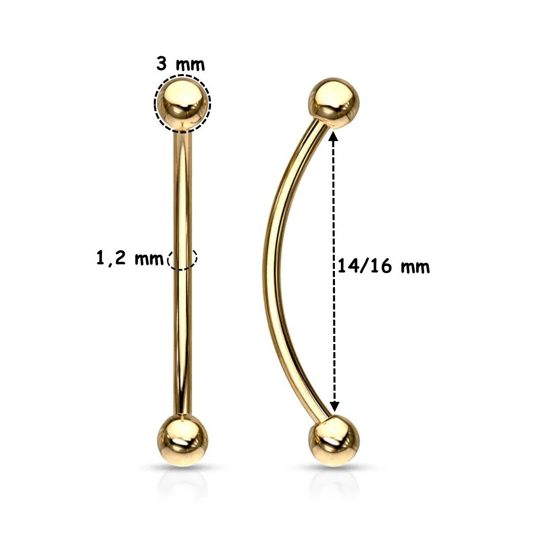 Barbell courbé en titane ASTM-F136 pour Snake Eyes. Filetage externe et billes 3 mm. Version 16 mm adaptée au lobe transversal. Titane poli, noir ou doré.