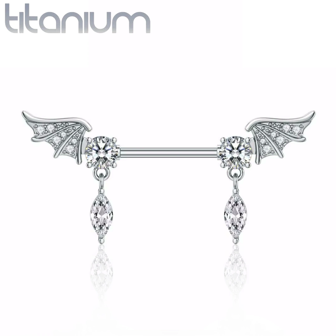 Piercing téton ailes d’anges en titane ASTM-F136, serti de zircons cubiques et de pierres marquise suspendues pour un éclat céleste et protecteur. Vendu à l’unité.