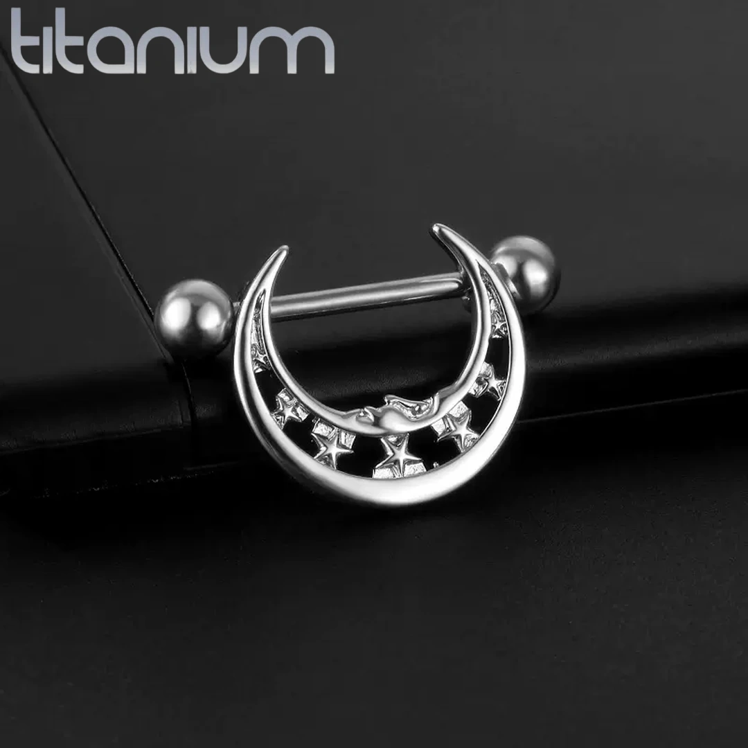 Piercing téton en forme de croissant de lune orné d’étoiles. Ce bijou en titane ASTM-F136 éclaire votre corps d’une lumière céleste. Vendu à l’unité.